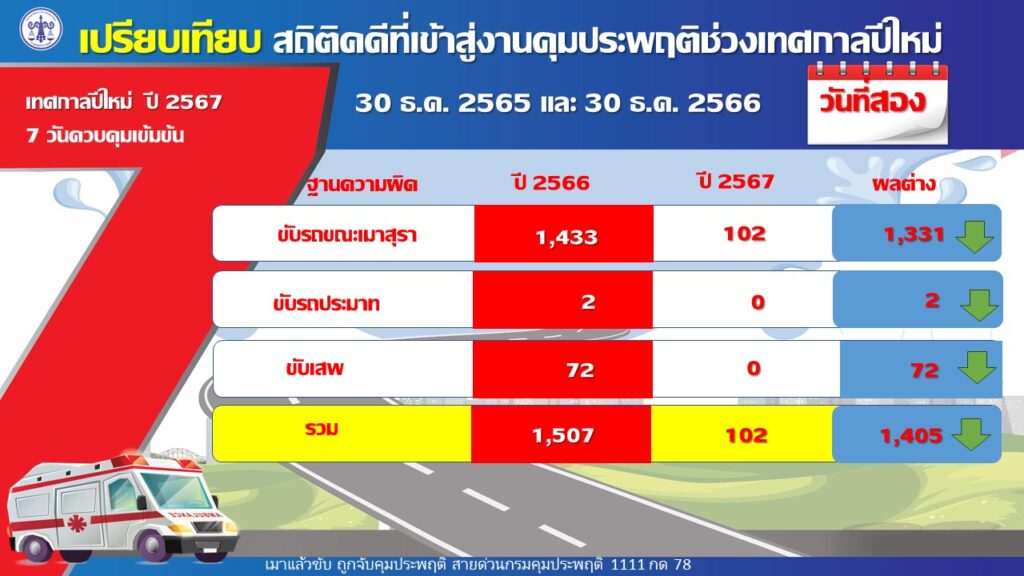 กทม. 31 ธ.ค.-วันที่สอง 7 วันอันตราย คุมประพฤติคดีเมาขับ สมุทรปราการนำอันดับหนึ่ง จังหวัดที่มีคดีเมาแล้วขับสะสมสูงสุด
