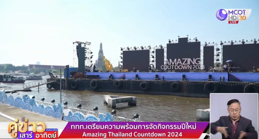 การท่องเที่ยวแห่งประเทศไทย หรือ ททท. จัดเตรียมเตรียมสถานที่สำหรับกิจกรรม “Amazing Thailand Countdown 2024 วิจิตร อรุณ” ที่สวนนาคราภิรมย์ ถนนมหาราช เขตพระนคร เพื่อให้เป็นสถานที่เฉลิมฉลองค่ำคืนส่งท้ายปีเก่าต้อนรับปีใหม่ที่ยิ่งใหญ่ ในค่ำคืนนี้ ภายใต้แนวคิด “วิจิตร อรุณ” ที่มีเวทีใหญ่กลางน้ำ สำหรับพิธีเปิดงานในช่วงเย็นวันนี้ และการแสดงต่างๆ ไม่ว่าจะเป็นการแสดงโขน การแสดงจากคณะโจหลุยส์ การบรรเลงเพลงออเครสตรา จากวง Chao Phraya Symphony Orchestra พร้อมขับกล่อมบรรยากาศด้วยบทเพลงจากศิลปิน รวมถึงการแสดงจากศิลปินชื่อดัง