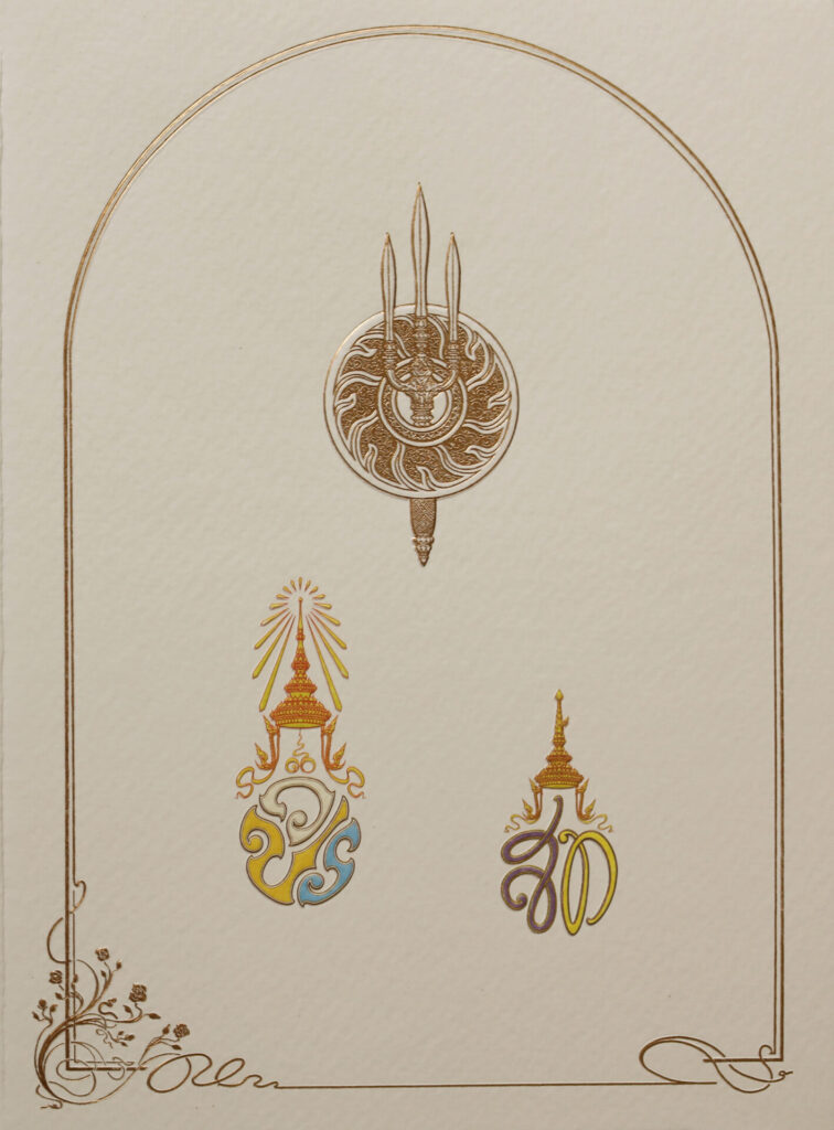 ใต้พระบรมฉายาลักษณ์ พิมพ์พระปรมาภิไธย พระบาทสมเด็จพระเจ้าอยู่หัว และพระนามาภิไธย สมเด็จพระนางเจ้าฯ พระบรมราชินี