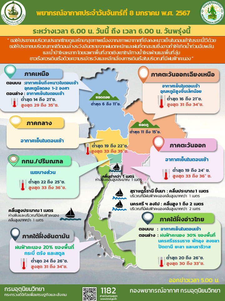 กรมอุตุนิยมวิทยา พยากรณ์อากาศ 24 ชั่วโมงข้างหน้า บริเวณความกดอากาศสูงหรือมวลอากาศเย็นกำลังปานกลางยังคงปกคลุมภาคตะวันออกเฉียงเหนือและทะเลจีนใต้ ในขณะที่ลมฝ่ายตะวันตกในระดับบนพัดปกคลุมภาคเหนือ ลักษณะเช่นนี้ทำให้ภาคเหนือมีอากาศเย็นถึงหนาวในตอนเช้า และอุณหภูมิจะลดลง 1-2 องศาเซลเซียส ส่วนภาคตะวันออกเฉียงเหนือ ภาคกลาง ภาคตะวันออก และภาคใต้ตอนบนยังคงมีอากาศเย็นในตอนเช้า สำหรับบริเวณยอดดอยของภาคเหนือมีอากาศหนาวถึงหนาวจัด อุณหภูมิต่ำสุด 6-11 องศาเซลเซียส ส่วนยอดภูของภาคตะวันออกเฉียงเหนือมีอากาศเย็นถึงหนาว อุณหภูมิต่ำสุด 11-16 องศาเซลเซียส ขอให้ประชาชนบริเวณประเทศไทยดูแลรักษาสุขภาพเนื่องจากสภาพอากาศที่ยังคงหนาวเย็นในตอนเช้าในระยะนี้ไว้ด้วย