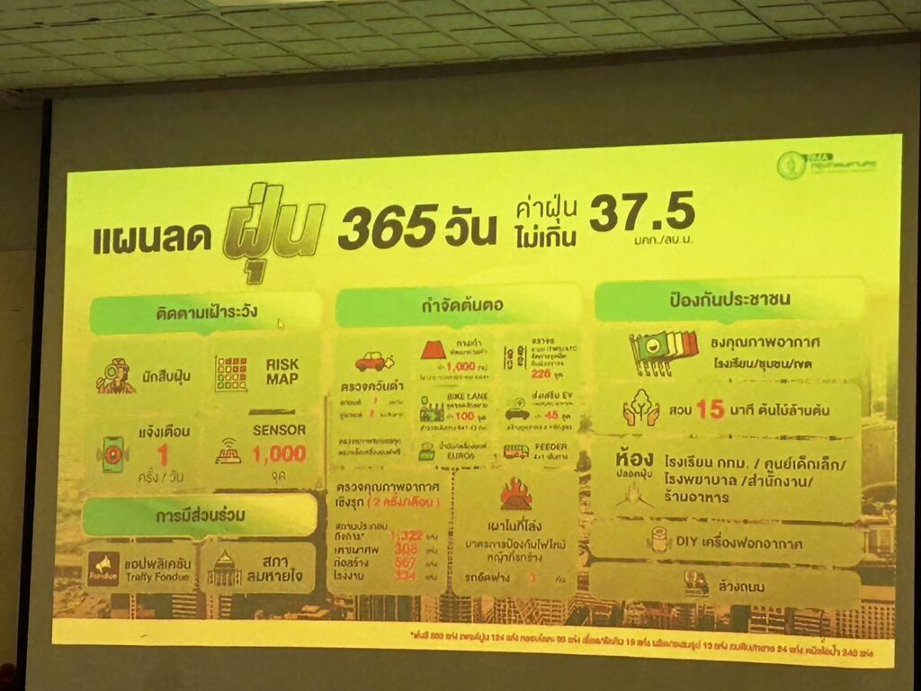 ด้วยปัจจุบันสถานการณ์ฝุ่นละออง PM2.5 ในกรุงเทพมหานครและประเทศไทยมีแนวโน้มอยู่ในระดับที่อาจส่งผลกระทบต่อสุขภาพของประชาชน กทม.จึงได้ดำเนินการเชิงรุกในเรื่องการแก้ปัญหาฝุ่นละอองในพื้นที่กรุงเทพฯ โดยแบ่งสาเหตุหลักออกเป็น 3 สาเหตุ คือ 1.ยานพาหนะหรือรถยนต์ 2. การเผาในที่โล่ง และ 3.ภาคอุตสาหกรรม ซึ่งปัจจัยใหญ่ที่สุดของต้นเหตุฝุ่นละอองในกรุงเทพฯ คือ ยานพาหนะที่ใช้ในการขนส่ง โดย กทม.ดำเนินการเชิงรุกด้วยการเข้าไปตรวจในไซต์ก่อสร้าง โดยนอกจากตรวจเรื่องฝุ่นจากการก่อสร้างแล้วยังตรวจควันดำของยานพาหนะที่ใช้ในการขนส่งด้วย หากพบปัญหาค่าฝุ่นเกินมาตรฐานจะมีการแจ้งเตือน 2 ครั้ง และหากยังไม่ดำเนินการแก้ไขจะยึดใบอนุญาตก่อสร้างทันที นอกจากนี้ยังขอความร่วมมือบริษัทน้ำมันและค่ายรถยนต์ประมาณ 16 ราย จัดทำโปรโมชันเปลี่ยนไส้กรองน้ำมันเครื่องและเปลี่ยนน้ำมันเครื่องได้ในราคาที่ถูกและไม่กระทบต่อรายได้ของประชาชนและผู้ประกอบการ เพื่อสร้างแรงจูงใจในการร่วมแก้ปัญหาฝุ่น PM2.5 จากเครื่องยนต์ ซึ่งคาดว่าจะสามารถลดฝุ่น PM2.5 ในเมืองกรุงได้กว่า 50%