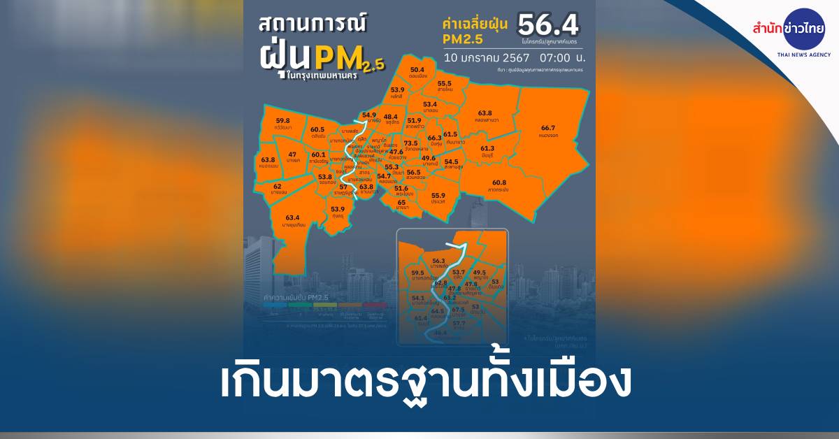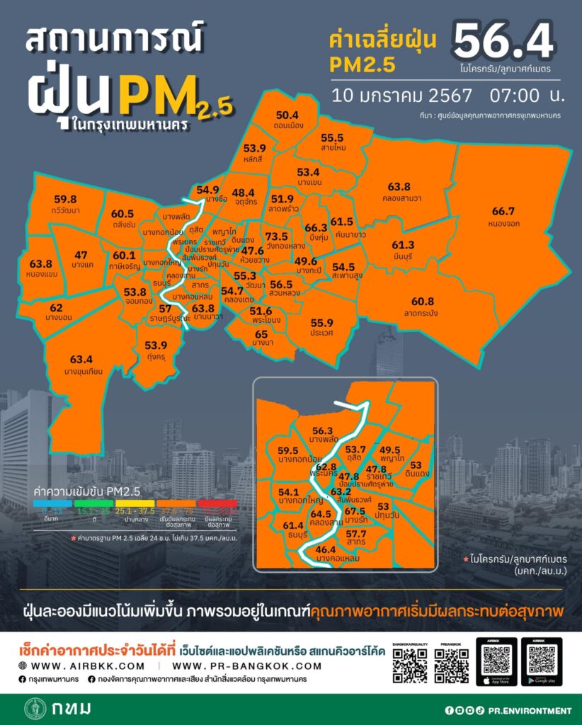 (10 ม.ค.) ศูนย์ข้อมูลคุณภาพอากาศกรุงเทพมหานครขอรายงานสถานการณ์ฝุ่นละอองขนาดไม่เกิน 2.5 ไมครอน (PM 2.5) ของสถานีตรวจวัดคุณภาพอากาศของกรุงเทพมหานคร ดัชนีคุณภาพอากาศของสถานีตรวจวัดของกรุงเทพมหานคร โดยฝุ่นละอองมีแนวโน้มเพิ่มขึ้น ภาพรวมอยู่ในเกณฑ์คุณภาพอากาศเริ่มมีผลกระทบต่อสุขภาพ ณ เวลา 07:00 น. โดยค่าเฉลี่ยของกรุงเทพมหานคร 56.4 มคก./ลบ.ม. ตรวจวัดค่าฝุ่นละออง PM2.5 ได้ในช่วง 41.9 – 73.1 ไมโครกรัม/ลูกบาศก์เมตร (มคก./ลบ.ม.) โดยมีแนวโน้มเพิ่มขึ้น เมื่อเทียบกับเมื่อวานในช่วงเวลาเดียวกัน และพบว่าเกินมาตรฐานอยู่ในระดับสีส้ม เริ่มมีผลกระทบต่อสุขภาพ (มาตรฐานไม่เกิน 37.5 มคก./ลบ.ม.) จำนวน 70 พื้นที่ คือ