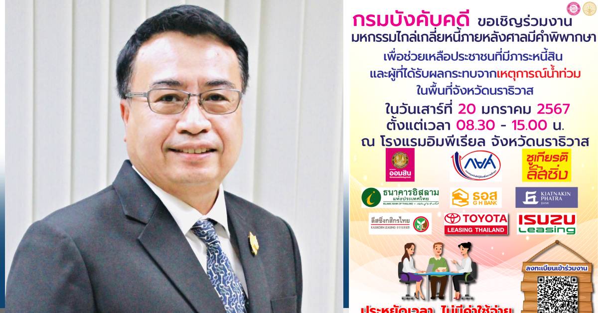 นายเสกสรร สุขแสง อธิบดีกรมบังคับคดี เปิดเผยว่า กรมบังคับคดีกำหนดจัดงานมหกรรมไกล่เกลี่ยหนี้ภายหลังศาลมีคำพิพากษา ในวันที่ 20 มกราคม 2567 ณ โรงแรมอิมพีเรียล จังหวัดนราธิวาส เพื่อช่วยเหลือประชาชนที่มีภาระหนี้สินต่าง ๆ ได้แก่ หนี้ครัวเรือน หนี้เช่าซื้อ หนี้ กยศ. ในพื้นที่จังหวัดชายแดนภาคใต้ และผู้ที่ได้รับผลกระทบจากเหตุการณ์น้ำท่วมในพื้นที่จังหวัดนราธิวาส จนเป็นเหตุให้เกิดปัญหาหนี้สิน