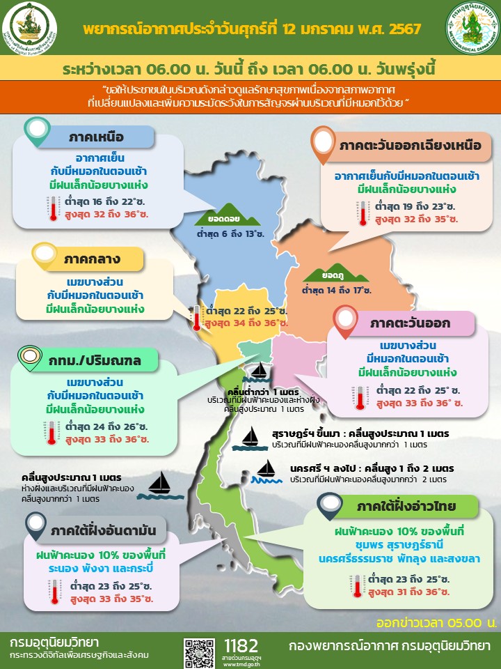 อนึ่ง ในช่วงวันที่ 13-16 ม.ค.67 คลื่นกระแสลมฝ่ายตะวันตกจากประเทศเมียนมาจะเคลื่อนผ่านประเทศไทยตอนบน ประกอบกับบริเวณความกดอากาศสูงกำลังปานกลางจากประเทศจีนระลอกใหม่จะแผ่ลงมาปกคลุมภาคตะวันออกเฉียงเหนือและทะเลจีนใต้ ลักษณะเช่นนี้ทำให้มีพายุฝนฟ้าคะนองลมกระโชกแรง และลูกเห็บตกบางแห่งส่วนมากบริเวณภาคเหนือ ภาคตะวันออกเฉียงเหนือตอนบน และภาคกลางตอนบน รวมถึงมีฟ้าผ่าที่อาจเกิดขึ้นได้ในระยะแรก หลังจากนั้นอุณหภูมิจะลดลงกับมีลมแรง โดยบริเวณภาคเหนือ และภาคตะวันออกเฉียงเหนืออุณหภูมิ จะลดลง 1-3 องศาเซลเซียส
