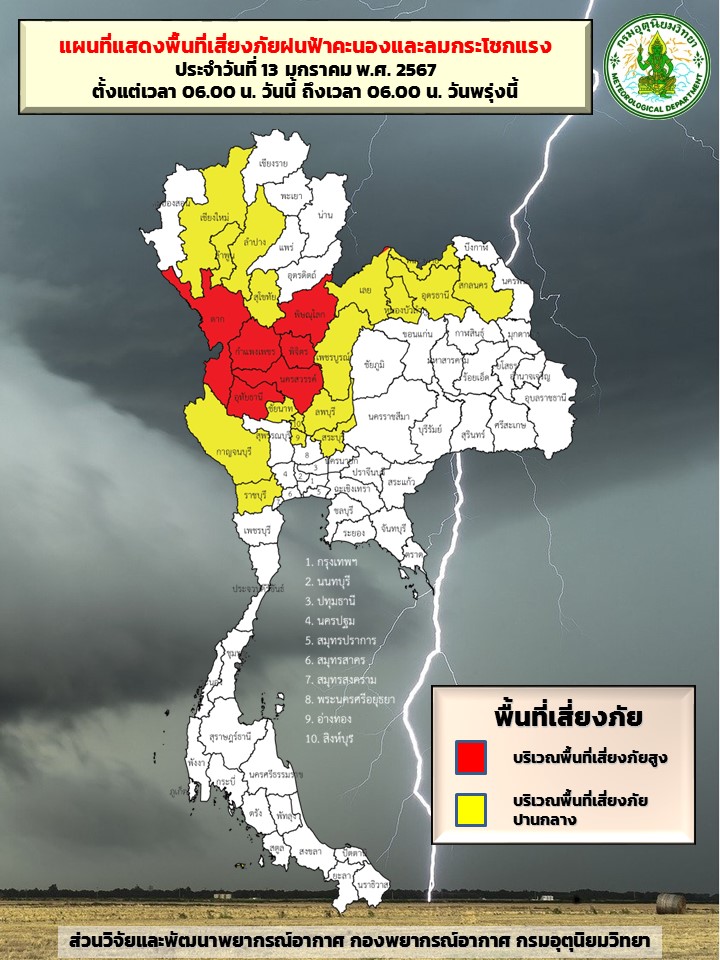 กทม. 13 ม.ค.- กรมอุตุฯ เตือนอากาศแปรปรวน หลายจังหวัดทั่วไทยมีฝนฟ้าคะนอง ลมกระโชกแรง และลูกเห็บตกบางแห่ง