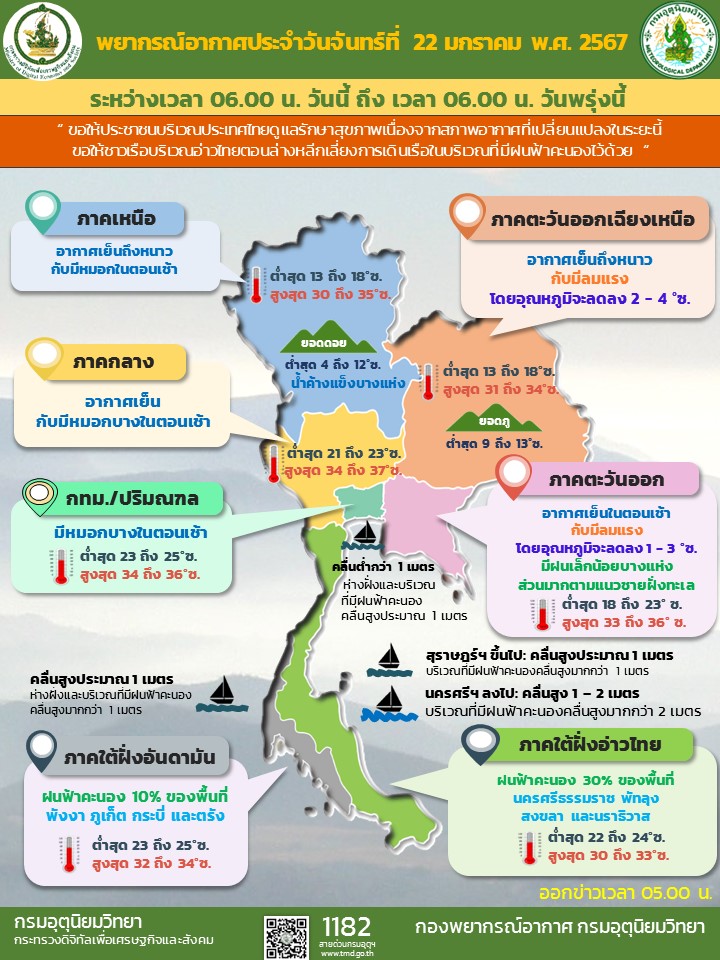กรมอุตุนิยมวิทยา พยากรณ์อากาศ 24 ชั่วโมงข้างหน้า บริเวณความกดอากาศสูงกำลังค่อนข้างแรงระลอกใหม่ได้แผ่ปกคลุมถึงบริเวณประเทศจีนตอนใต้และเวียดนามตอนบนแล้ว คาดว่าจะแผ่คลุมภาคตะวันออกเฉียงเหนือและภาคตะวันออกในวันนี้ (วันที่ 22 ม.ค. 67) โดยจะทำให้ภาคตะวันออกเฉียงเหนือมีอากาศเย็นถึงหนาวในตอนเช้ากับมีลมแรง และอุณหภูมิจะลดลง 2-4 องศาเซลเซียส ส่วนภาคตะวันออกมีอากาศเย็นในตอนเช้ากับมีลมแรง และอุณหภูมิจะลดลง 1-3 องศาเซลเซียส ขอให้ประชาชนบริเวณประเทศไทยดูแลรักษาสุขภาพเนื่องจากสภาพอากาศที่เปลี่ยนแปลงในระยะนี้