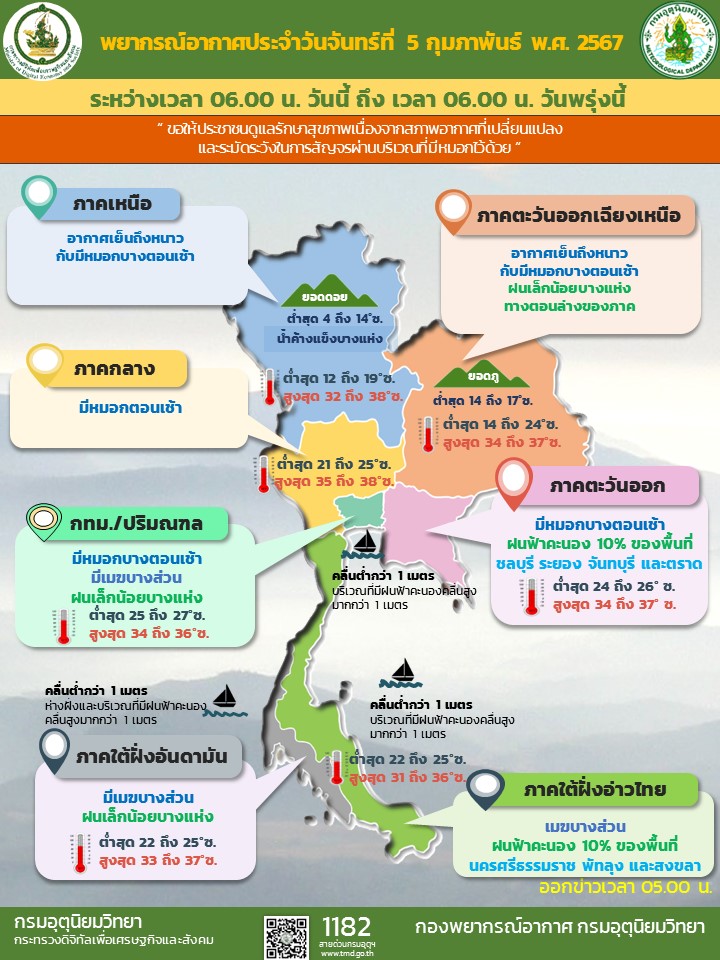 กรุงเทพฯ 5 ก.พ. – อุตุฯ เผยภาคเหนือ-อีสาน อากาศเย็นถึงหนาวในตอนเช้า และมีฝนฟ้าคะนองบางแห่งในภาคอีสาน-ตะวันออก ส่วนบริเวณไทยตอนบน มีการสะสมของฝุ่นละออง ปานกลางถึงมาก