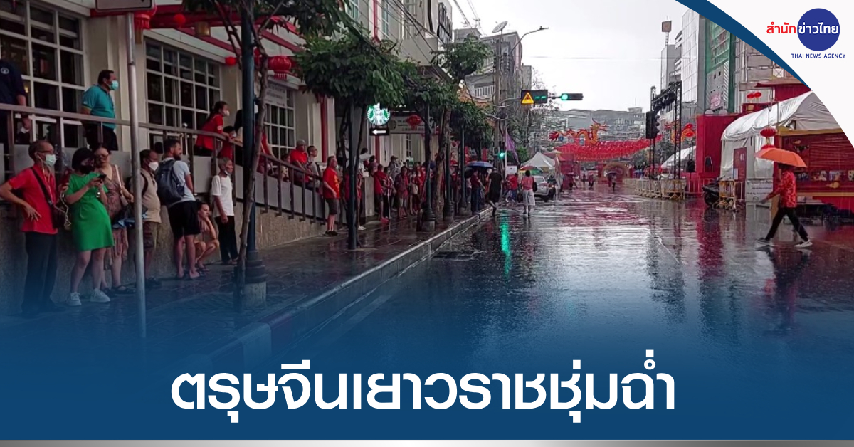 เยาวราช 10 ก.พ. – ชุ่มฉ่ำอีกแล้ว บรรยากาศตรุษจีนเยาวราช ในช่วงบ่าย แต่ก็ไม่เป็นอุปสรรคสำหรับวันเที่ยวของเทศกาลตรุษจีน นักท่องเที่ยวยังคงเดินทางมาต่อเนื่อง โดยหลบฝนตามมูลนิธิและศาลเจ้า ไหว้เทพเจ้าเสริมสิริมงคล และรอเดินเที่ยวต่อในช่วงเย็น