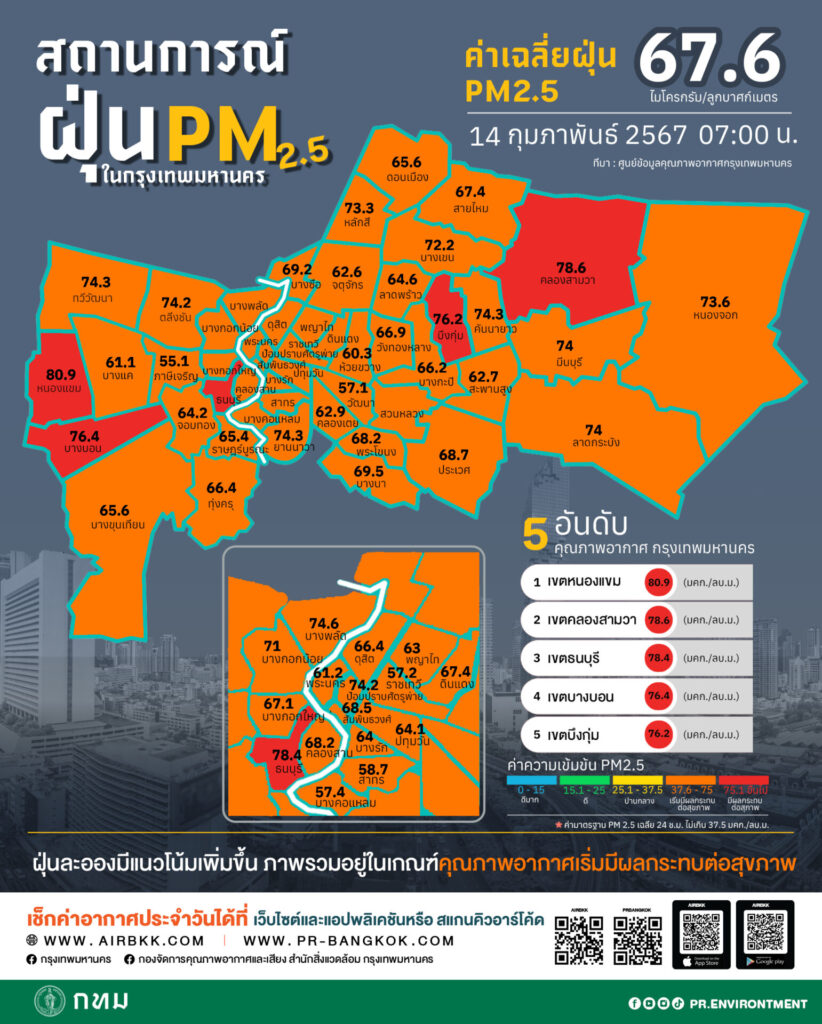 ศูนย์ข้อมูลคุณภาพอากาศกรุงเทพมหานคร รายงานสถานการณ์ฝุ่นละอองขนาดไม่เกิน 2.5 ไมครอน หรือ PM 2.5 เมื่อเวลา 07.00 น. สูงสุด 5 อันดับแรก ได้แก่ เขตหนองแขม 80.9 ไมโครกรัม/ลูกบาศก์เมตร เขตคลองสามวา 78.6 ไมโครกรัม/ลูกบาศก์เมตร เขตธนบุรี 78.4 ไมโครกรัม/ลูกบาศก์เมตร เขตบางบอน 76.4 ไมโครกรัม/ลูกบาศก์เมตร เขตบึงกุ่ม 76.2 ไมโครกรัม/ลูกบาศก์เมตร โดยค่าเฉลี่ยของกรุงเทพมหานครอยู่ที่ 67.6 ไมโครกรัมต่อลูกบาศก์เมตร