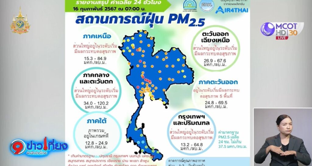 กรุงเทพฯ 16 ก.พ. – เช้านี้ (16 ก.พ.) ค่าฝุ่นมีแนวโน้มลดลง แต่ยังเกินมาตรฐานอยู่ในระดับสีส้ม 55 พื้นที่ กทม. ขอความร่วมมือภาครัฐ-เอกชน Work From Home ส่วนภาพรวมทั่วประเทศยังเกินมาตรฐานใน 48 จังหวัด