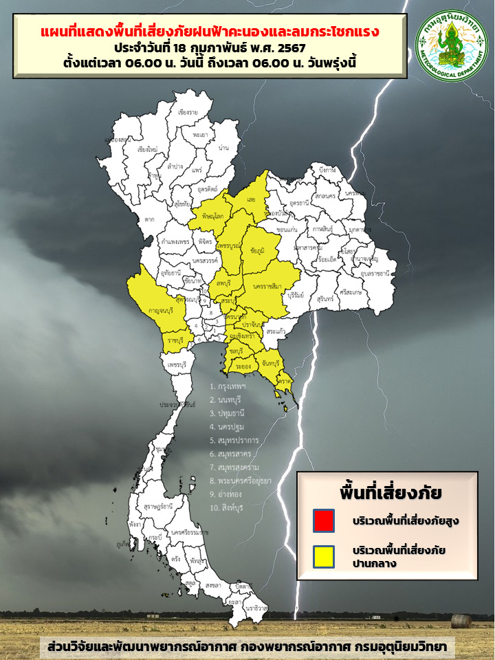 กทม. 18 ก.พ.- กรมอุตุฯ เผยอีสานตอนล่าง ตะวันออก กลาง รวมทั้ง กทม.-ปริมณฑล มีฝนฟ้าคะนองกับมีลมกระโชกแรง ส่วนภาคใต้ยังคงมีฝนฟ้าคะนองบางแห่ง