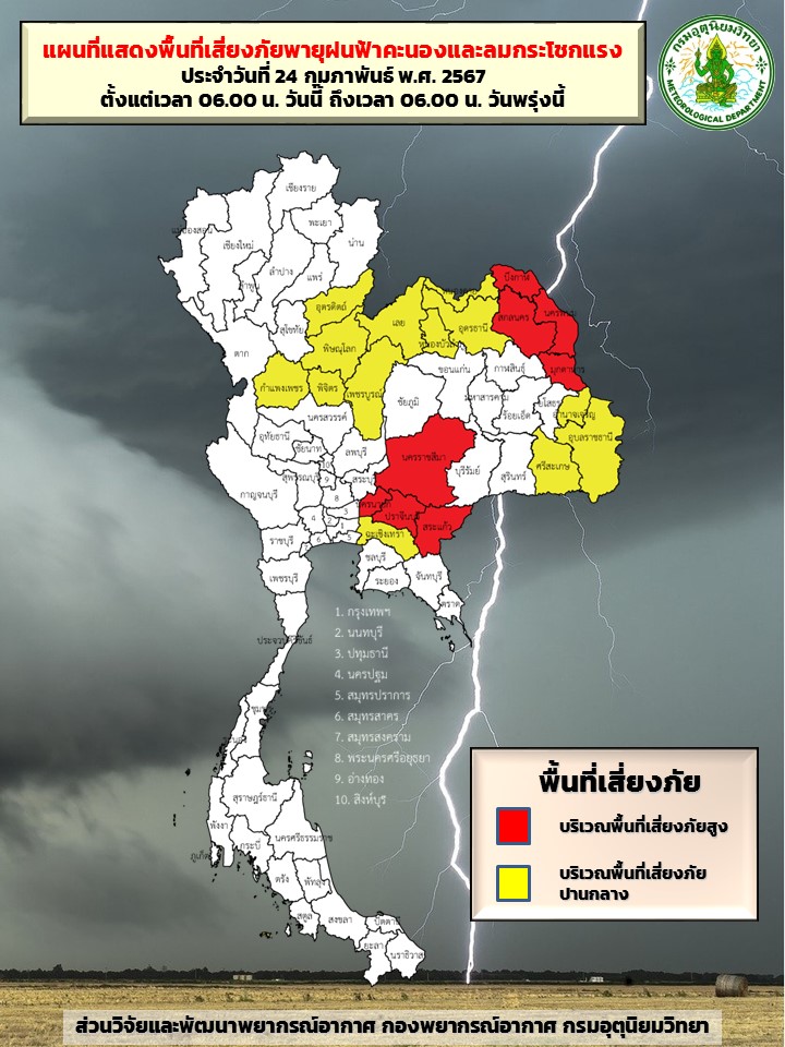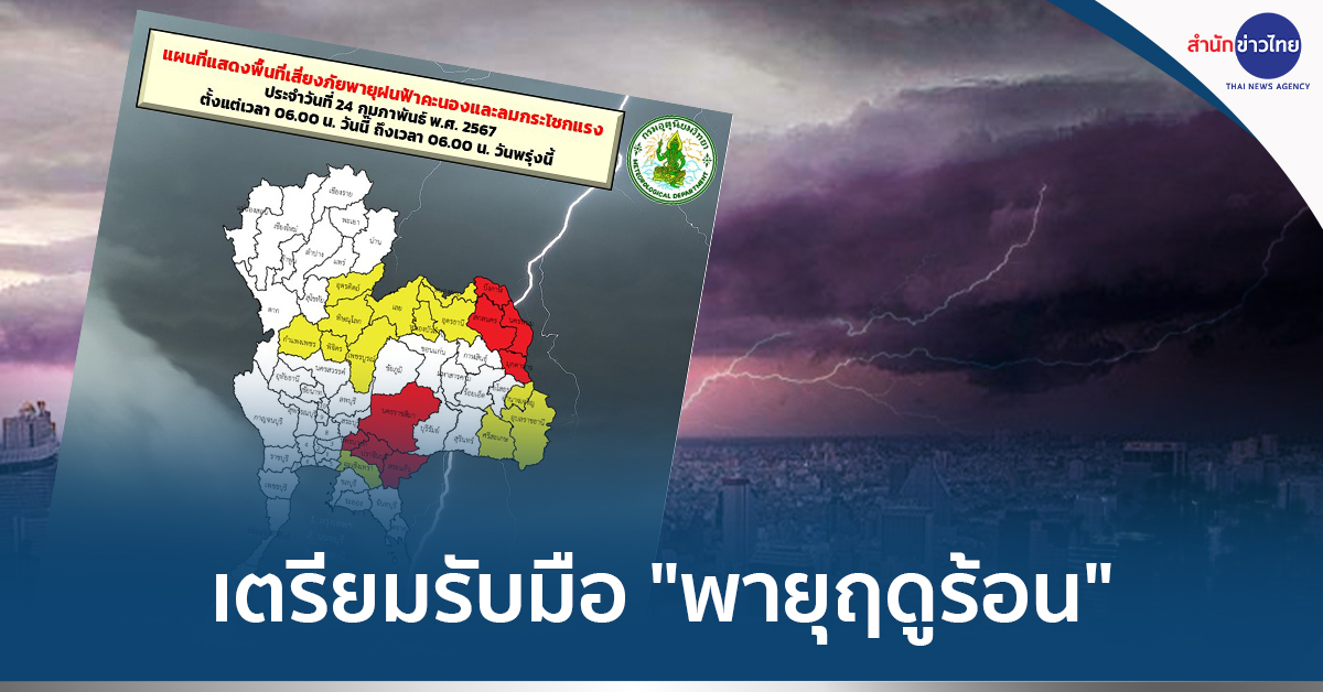 กรมอุตุนิยมวิทยา เผยความกดอากาศต่ำเนื่องจากความร้อนปกคลุมประเทศไทยตอนบน ทำให้บริเวณดังกล่าวมีอากาศร้อนในหลายพื้นที่ ในขณะที่บริเวณความกดอากาศสูงหรือมวลอากาศเย็นจากประเทศจีนได้แผ่ลงมาปกคลุมประเทศเวียดนามและประเทศลาวตอนบนแล้ว คาดว่าจะแผ่ลงมาปกคลุมด้านตะวันออกของภาคตะวันออกเฉียงเหนือและทะเลจีนใต้ในวันนี้ (24 ก.พ. 67) ประกอบกับลมใต้และลมตะวันออกเฉียงใต้พัดปกคลุมอ่าวไทยและประเทศไทย ลักษณะเช่นนี้จะทำให้บริเวณประเทศไทยตอนบนมีพายุฤดูร้อนเกิดขึ้น โดยมีลักษณะของพายุฝนฟ้าคะนอง ลมกระโชกแรง และลูกเห็บตกบางแห่ง รวมถึงฟ้าผ่าที่อาจจะเกิดขึ้นได้ ขอให้ประชาชนในบริเวณดังกล่าวระวังอันตรายจากพายุฤดูร้อนที่อาจจะเกิดขึ้น โดยหลีกเลี่ยงการอยู่ในที่โล่งแจ้ง ใต้ต้นไม้ใหญ่ สิ่งปลูกสร้างและป้ายโฆษณาที่ไม่แข็งแรง สำหรับเกษตรกรควรเตรียมการป้องกันและระวังความเสียหายที่จะเกิดต่อผลผลิตทางการเกษตรและอันตรายต่อสัตว์เลี้ยงในช่วงวันและเวลาดังกล่าวไว้ด้วย