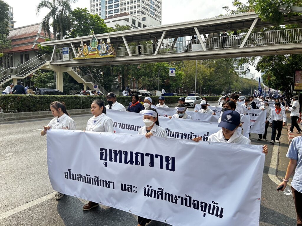 กทม. 27 ก.พ.-นักศึกษาและศิษย์เก่า วิทยาเขตอุเทนถวาย ตั้งแถวเดินขบวนถือป้าย พร้อมตะโกนตลอดเส้นทาง ยืนยันไม่ย้าย และจะต่อสู้ต่อไป จากนั้นขบวนมาหยุดหน้าอาคารสำนักงานทรัพย์สิน จุฬาฯ และผู้นำกิจกรรมเริ่มปราศรัยบนรถ