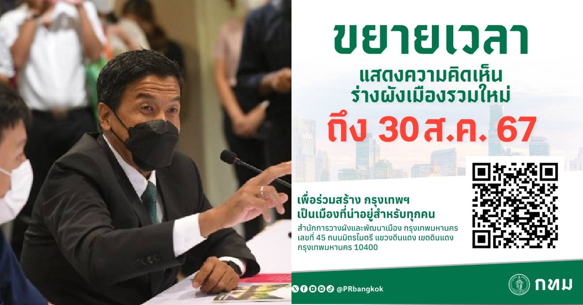 เพื่อให้การรับฟังความคิดเห็นเป็นไปอย่างทั่วถึงและประชาชนทุกภาคส่วนได้มีระยะเวลาพิจารณาผังเมืองรวมกรุงเทพมหานคร (ปรับปรุงครั้งที่ 4) อย่างรอบด้าน รวมทั้งเพื่อให้ทราบถึงผลกระทบที่อาจจะเกิดขึ้นกับประชาชน กรุงเทพมหานครจึงแก้ไขเพิ่มเติมประกาศฯ โดยกำหนดระยะเวลาการแสดงความคิดเห็น จนถึงวันที่ 30 สิงหาคม 2567 ทั้งนี้ ให้ยื่นแสดงความคิดเห็นดังกล่าวเป็นลายลักษณ์อักษรผ่านช่องทาง ดังต่อไปนี้