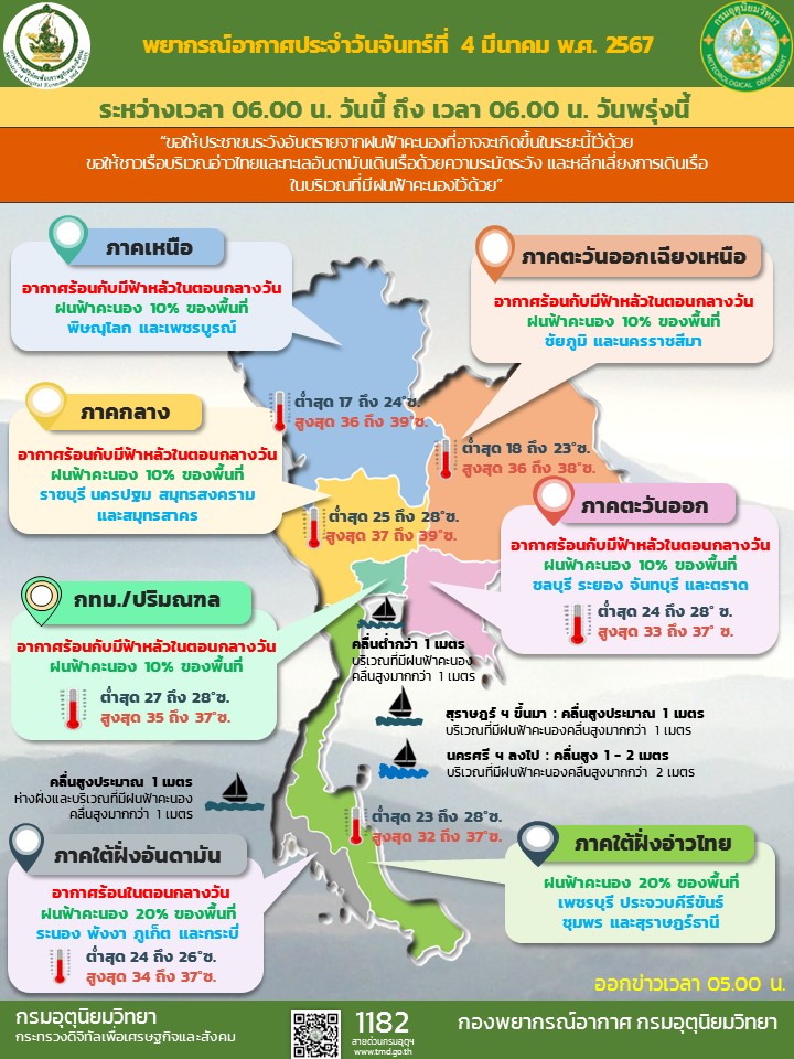 กรุงเทพฯ 4 มี.ค. – กรมอุตุฯ เผยไทยตอนบนอากาศร้อนกับมีฟ้าหลัวตอนกลางวัน และมีฝนฟ้าคะนองเกิดขึ้นได้บางพื้นที่