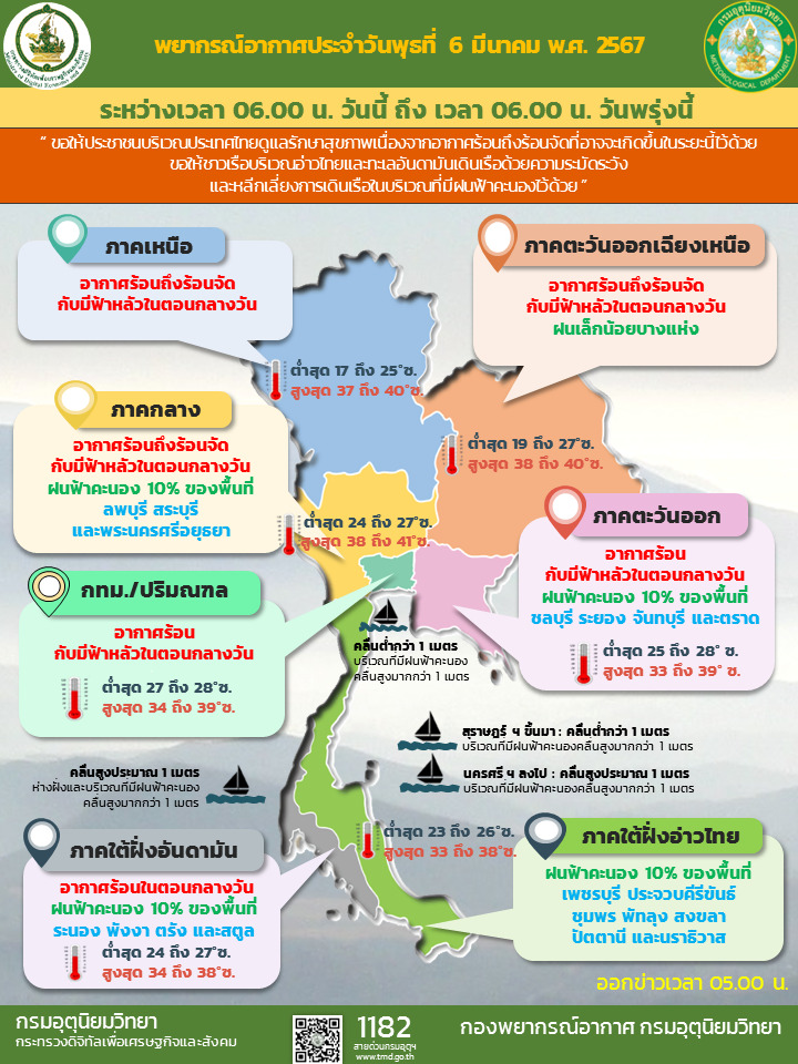 กรุงเทพฯ 6 มี.ค. – กรมอุตุฯ เผยไทยตอนบนอากาศร้อนถึงร้อนจัด ขณะที่ภาคกลางตอนล่างและภาคตะวันออก มีฝนฟ้าคะนองเกิดขึ้นได้บางพื้นที่