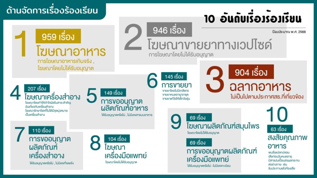 สำหรับ 10 อันดับเรื่องร้องเรียน ได้แก่ 1. โฆษณาอาหาร 959 เรื่อง 2. โฆษณาขายยาทางเว็บไซต์ 946 เรื่อง 3. ฉลากอาหาร 904 เรื่อง 4. โฆษณาเครื่องสำอาง 207 เรื่อง 5. การขออนุญาตอาหาร 149 เรื่อง 6. การขายยา 145 เรื่อง 7. การขออนุญาตเครื่องสำอาง 110 เรื่อง 8. โฆษณาเครื่องมือแพทย์ 104 เรื่อง 9. โฆษณาผลิตภัณฑ์สมุนไพร 69 เรื่อง การขออนุญาตเครื่องมือแพทย์ 69 เรื่อง และ 10. สงสัยคุณภาพอาหาร 63 เรื่อง