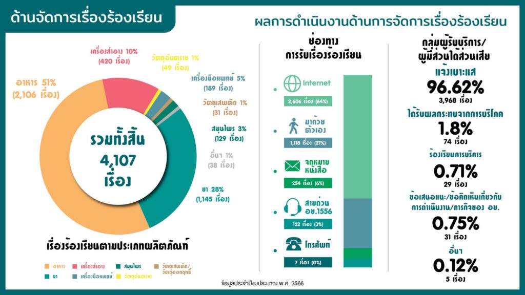 ทั้งนี้ อย. ให้ความสำคัญกับเสียงของผู้บริโภค โดยในปีงบประมาณ พ.ศ.2566 อย. ได้รับเรื่องร้องเรียนเกี่ยวกับอาหาร 2,106 เรื่อง ยา 1,145 เรื่อง เครื่องสำอาง 420 เรื่อง เครื่องมือแพทย์ 189 เรื่อง สมุนไพร 129 เรื่อง วัตถุอันตราย 49 เรื่อง วัตถุเสพติด 31 เรื่อง อื่น ๆ 38 เรื่อง รวม 4,107 เรื่อง