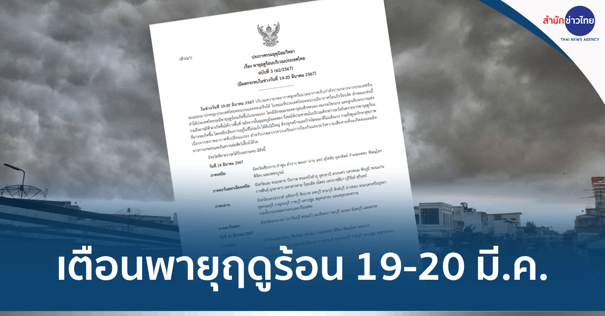 ประกาศกรมอุตุนิยมวิทยา เรื่อง พายุฤดูร้อนบริเวณประเทศไทย ฉบับที่ 3 (62/2567) มีผลกระทบในช่วงวันที่ 19-20 มีนาคม 2567