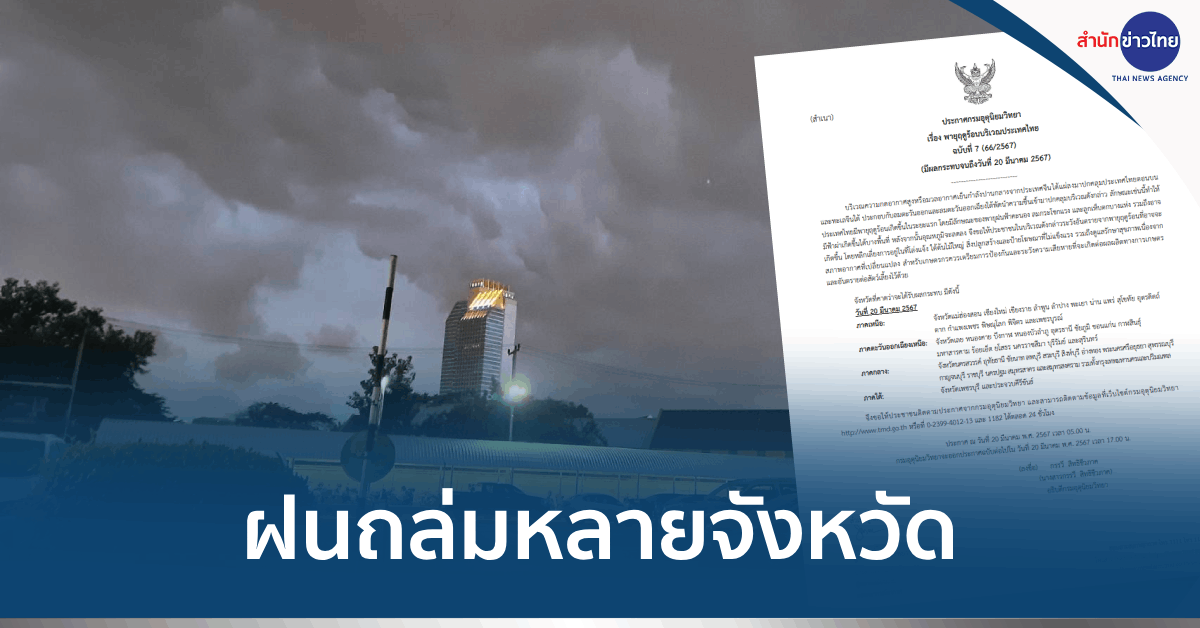 กรมอุตุนิยมวิทยา ออกประกาศเตือนเรื่อง พายุฤดูร้อนบริเวณประเทศไทย ฉบับที่ 7 (66/2567) มีผลกระทบจนถึงวันที่ 20 มีนาคม 2567