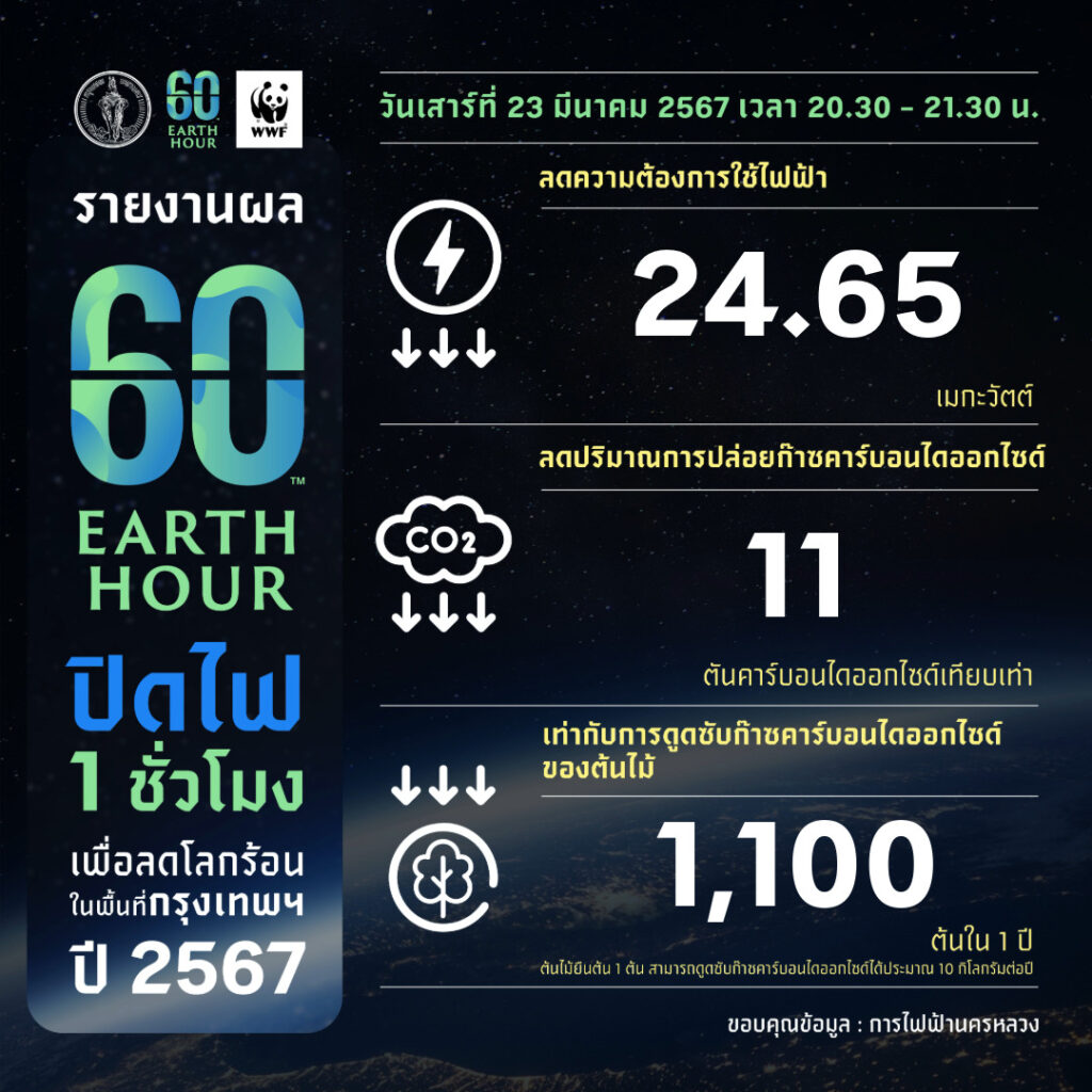 โดยในปีนี้ 5 Landmark หลักของกรุงเทพมหานคร ได้แก่ วัดพระศรีรัตนศาสดาราม (วัดพระแก้ว) พระบรมมหาราชวัง วัดอรุณราชวรารามราชวรมหาวิหาร เสาชิงช้า สะพานพระราม 8 และวัดสระเกศราชวรมหาวิหาร (ภูเขาทอง) ได้ร่วมปิดไฟเชิงสัญลักษณ์ด้วย ซึ่งจากการคำนวณปริมาณการใช้ไฟฟ้าช่วงเวลาดังกล่าวในพื้นที่กรุงเทพฯ โดยการไฟฟ้านครหลวง พบว่า กิจกรรม #ปิดไฟ 1 ชั่วโมง เพื่อลดโลกร้อน ปี 2567 นี้ ในพื้นที่กรุงเทพมหานคร สามารถลดปริมาณการใช้ไฟฟ้าได้ 24.65 เมกะวัตต์ เมื่อเปรียบเทียบกับการใช้ไฟฟ้าในพื้นที่กรุงเทพมหานคร เมื่อวันเสาร์ที่ 16 มีนาคม 2567 ระหว่างเวลา 20.30 – 21.30 น. ลดความต้องการการใช้ไฟฟ้าลงได้ 24.65 เมกะวัตต์ ลดปริมาณการปล่อยก๊าซคาร์บอนไดออกไซด์ได้ 11 ตันคาร์บอนไดออกไซด์เทียบเท่า เทียบได้กับการดูดซับก๊าซคาร์บอนไดออกไซด์ของต้นไม้ 1,100 ต้น ใน 1 ปี (ต้นไม้ยืนต้น 1 ต้น สามารถดูดซับก๊าซคาร์บอนไดออกไซด์ได้ประมาณ 10 กิโลกรัมต่อปี) และสามารถลดค่าไฟฟ้าลงได้ 130,182 บาท