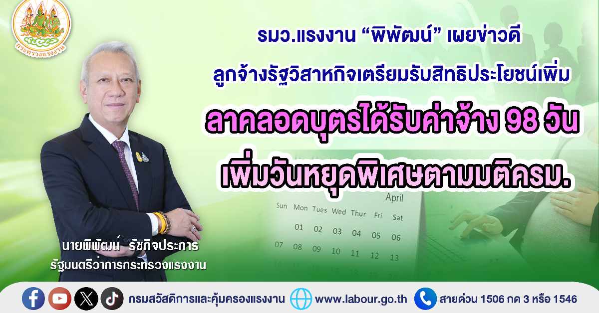 นายพิพัฒน์ รัชกิจประการ รัฐมนตรีว่าการกระทรวงแรงงาน เผยข่าวดี เพิ่มสิทธิประโยชน์ลูกจ้างรัฐวิสาหกิจให้ลาเพื่อคลอดบุตรโดยได้รับค่าจ้าง 98 วัน เพิ่มวันหยุดพิเศษตามมติคณะรัฐมนตรีให้เป็นวันหยุดตามกฎหมาย พร้อมปรับปรุงการรักษาโรคโควิดให้สอดคล้องตามที่กระทรวงสาธารณสุขกำหนด หลัง ครม.มีมติเห็นชอบร่างประกาศคณะกรรมการแรงงานรัฐวิสาหกิจสัมพันธ์ 2 ฉบับ ตามที่กระทรวงแรงงานเสนอ คาดใช้บังคับ พฤษภาคมนี้