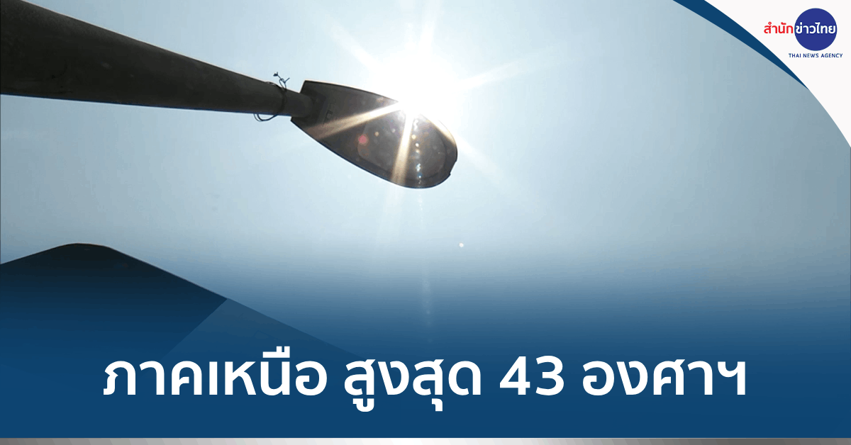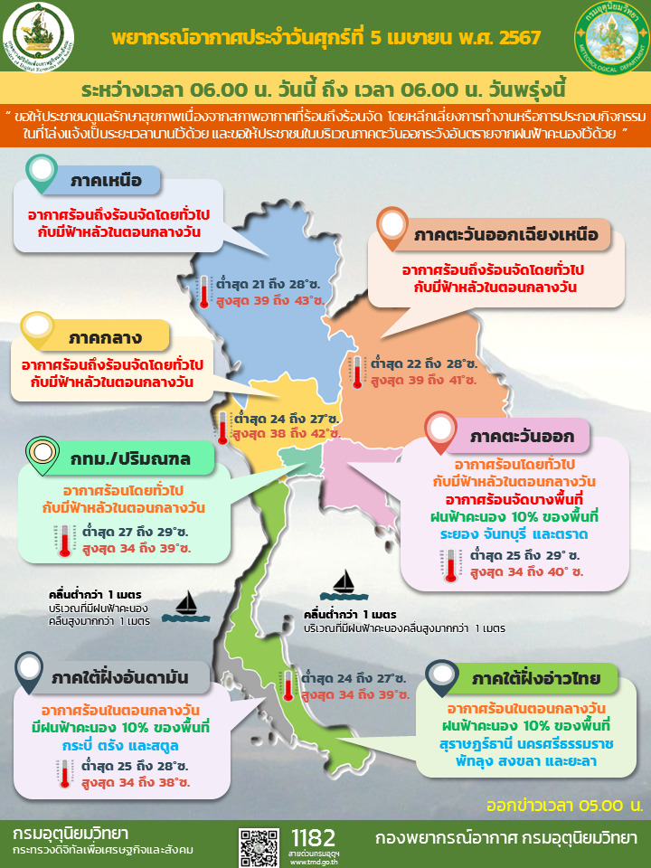 กรุงเทพฯ 5 เม.ย. – กรมอุตุฯ เผยประเทศไทยอากาศร้อนถึงร้อนจัด ภาคเหนือ อุณหภูมิสูงสุด 43 องศาฯ แนะหลีกเลี่ยงการทำงานหรือการประกอบกิจกรรมในที่โล่งแจ้งเป็นเวลานาน