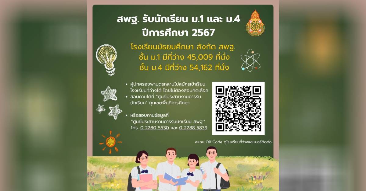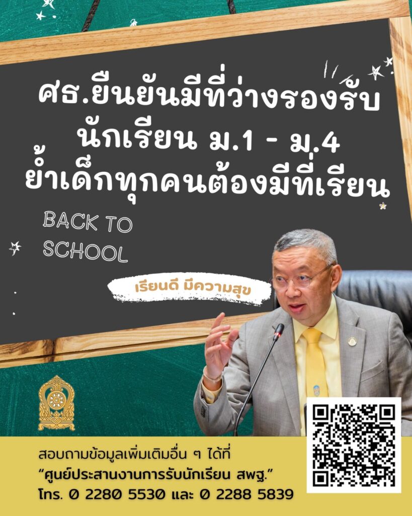 กทม. 7 เม.ย.-ศธ. แจ้งรายชื่อโรงเรียนมัธยมในสังกัดทั่วประเทศ ยังมีที่ว่างรองรับนักเรียน ม.1 – ม.4 ย้ำเด็กทุกคนต้องมีที่เรียน