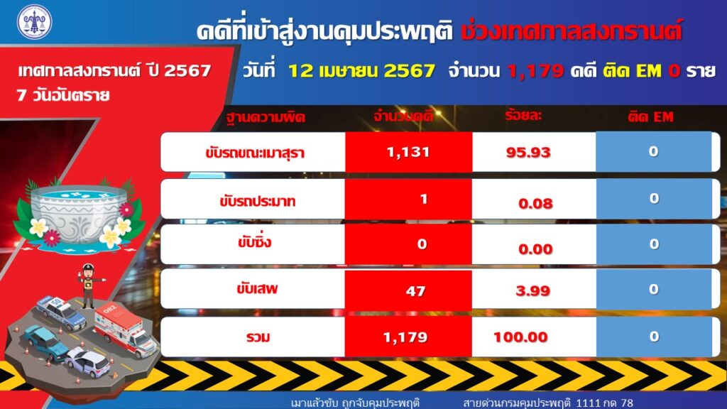 นายเรืองศักดิ์ สุวารี อธิบดีกรมคุมประพฤติ กล่าวว่า วันที่สองของการควบคุมเข้มงวดในช่วง 7 วันอันตราย (12 เมษายน 2567) มีคดีที่เข้าสู่กระบวนการคุมความประพฤติทั้งสิ้น 1,179 คดี เป็นคดีขับรถขณะเมาสุรา 1,131 คดี คดีขับรถประมาท 1 คดี คดีขับเสพ 47 คดี สถิติคดีเมาขับสะสมสูงสุดอันดับหนึ่งได้แก่ กรุงเทพมหานคร มี 191 คดี รองลงมา นนทบุรี 120 คดี และอันดับสาม สมุทรปราการ 107 คดี เมื่อเปรียบเทียบสถิติคดีเข้าสู่งานคุมประพฤติในวันที่สองของช่วงเทศกาลสงกรานต์ พ.ศ. 2566 และ พ.ศ. 2567 พบว่า คดีขับรถขณะเมาสุรา ปี พ.ศ. 2566 จำนวน 1,061 คดี และปี พ.ศ. 2566 มีจำนวน 1,131 คดี เพิ่มขึ้น 70 คดี คิดเป็นร้อยละ 6.59