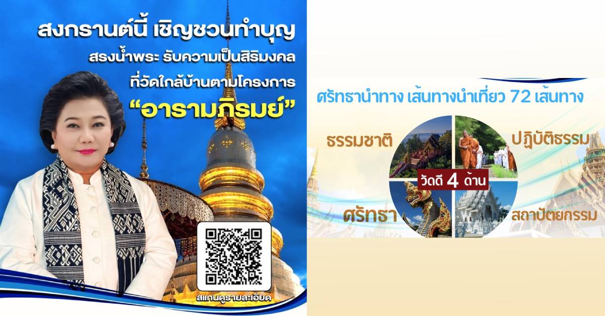โดยมีข้อความว่า “สงกรานต์นี้ อยากเชิญชวนทุกท่านและครอบครัว ไปทำบุญ สรงน้ำพระ พร้อมรับความเป็นสิริมงคล ที่วัดใกล้บ้านท่าน ตามโครงการ อารามภิรมย์ และ โครงการศรัทธานำทาง เส้นทางนำเที่ยว ทั้ง 72 เส้นทางทั่วไทย โดยจำแนกเป็นวัดดี 4 ด้าน คือ ด้านสถาปัตยกรรมเด่น ด้านศรัทธา ด้านธรรมชาติ และด้านปฏิบัติธรรม สามารถติดตามทั้ง 72 เส้นทางทั่วไทย ได้ที่ลิงก์นี้ หรือสแกนคิวอาร์โค้ด https://drive.google.com/drive/mobile/folders/1GqTqXxNJV5yW_S1m6iV88HFqEfYs86MD . 111 -สำนักข่าวไทย