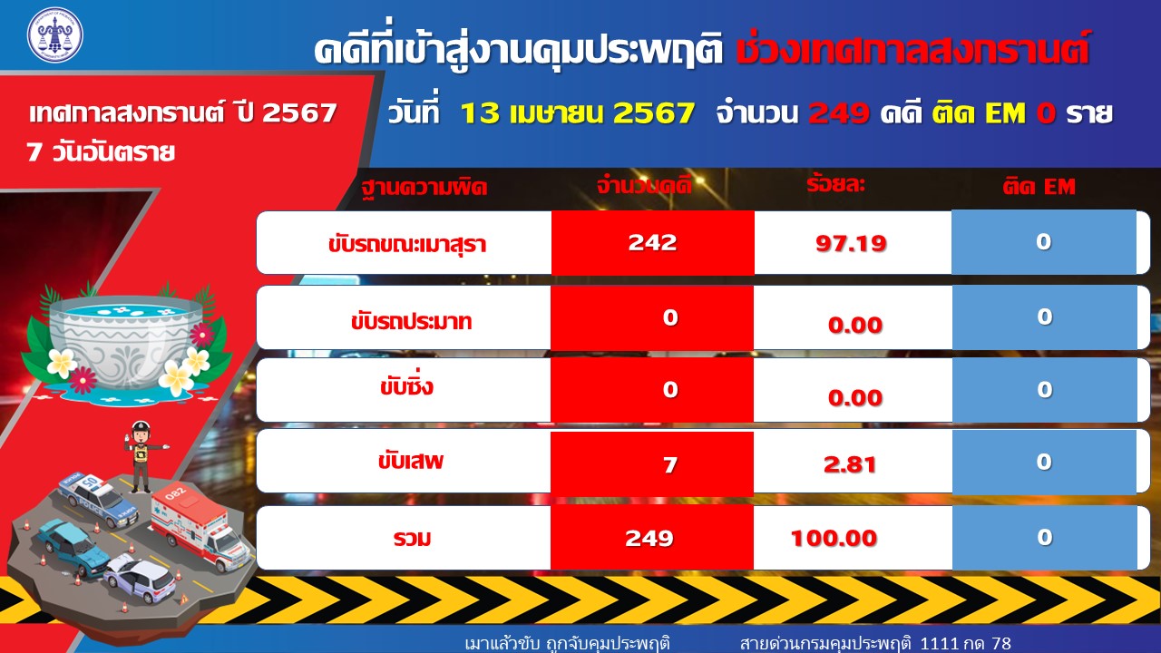 นายเรืองศักดิ์ สุวารี อธิบดีกรมคุมประพฤติ กล่าวถึง สถิติคดีที่ศาลสั่งคุมความประพฤติวันที่สามของ 7 วันอันตราย (13 เมษายน 2567) มีคดีทั้งสิ้น 249 คดี เป็นคดีขับรถขณะเมาสุรา 242 คดี และ คดีขับเสพ 7 คดี โดยสถิติคดีเมาขับยอดสะสม 3 วัน ได้แก่ อันดับหนึ่ง กรุงเทพมหานคร 222 คดี อันดับสอง เชียงใหม่ 125 คดี และอันดับสามจังหวัดนนทบุรี 120 คดี เมื่อเปรียบเทียบสถิติคดีในวันที่สาม ของ 7 วันอันตรายปี 2566 พบว่า คดีขับรถขณะเมาสุรา จำนวน 1,845 คดี และปี 2567 จำนวน 242 คดี ลดลง จำนวน 1,603 คดี คิดเป็นร้อยละ 86.88