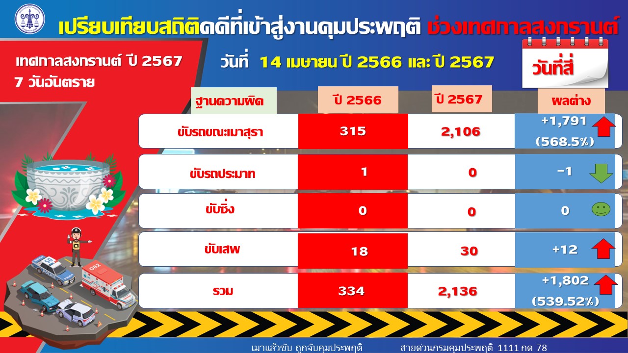 นายเรืองศักดิ์ สุวารี อธิบดีกรมคุมประพฤติ กล่าวว่า ในช่วงเทศกาลสงกรานต์ มีสถิติคดีที่ศาลสั่งคุมความประพฤติในวันที่ 14 เมษายน 2567 รวมทั้งสิ้น 2,136 คดี จำแนกเป็น คดีขับรถขณะเมาสุรา 2,106 คดี และคดีขับเสพ 30 คดี สำหรับยอดรวมสะสม 4 วัน ของ 7 วันอันตราย มีจำนวน 3,890 คดี จำแนกเป็น คดีขับรถขณะเมาสุรา 3,737 คดี คิดเป็นร้อยละ 96.07 คดีขับรถประมาท 3 คดี คิดเป็นร้อยละ 0.08 คดีขับเสพ 150 คดี คิดเป็นร้อยละ 3.85 โดยกรุงเทพมหานคร มีคดีเมาขับสูงสุดอันดับหนึ่ง 399 คดี รองลงมา นนทบุรี 227คดี และสมุทรปราการ 214 คดี ทั้งนี้ เมื่อเปรียบเทียบสถิติคดีเข้าสู่คุมประพฤติในวันที่ 4 ของ 7 วันอันตรายปี 2566 พบว่า คดีขับรถขณะเมาสุรา จำนวน 315 คดี และ ปี 2567 จำนวน 2,106 คดี เพิ่มขึ้น 1,791 คดี