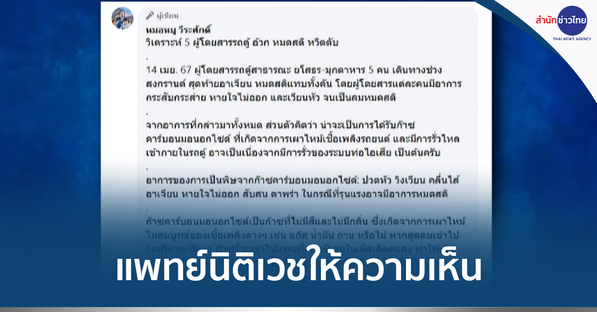 รองศาสตราจารย์ นายแพทย์วีระศักดิ์ จรัสชัยศรี หรือหมอหมู แพทย์ผู้เชี่ยวชาญด้านนิติเวชศาสตร์ มศว ได้โพสต์ผ่านเพจเฟซบุ๊ก หมอหมู วีระศักดิ์ ระบุข้อความว่า ผู้โดยสารรถตู้สาธารณะ ยโสธร-มุกดาหาร 5 คน เดินทางช่วงสงกรานต์ สุดท้ายอาเจียน หมดสติแทบทั้งคัน โดยผู้โดยสารแต่ละคน มีอาการกระสับกระส่าย หายใจไม่ออก และเวียนหัว จนเป็นลมหมดสติ ส่วนตัวคิดว่า น่าจะเป็นการได้รับก๊าซคาร์บอนมอนอกไซด์ ที่เกิดจากการเผาไหม้เชื้อเพลิงรถยนต์ และมีการรั่วไหลเข้าภายในรถตู้ อาจเป็นเนื่องจากมีการรั่วของระบบท่อไอเสีย