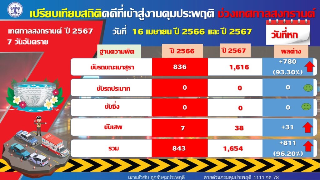 นายเรืองศักดิ์ สุวารี อธิบดีกรมคุมประพฤติ เปิดเผยถึง สถิติคดีที่ศาลสั่งคุมความประพฤติ (16 เมษายน 2567) มีจำนวนทั้งสิ้น 1,654 คดี จำแนกเป็น คดีขับรถในขณะเมาสุรา 1,616 คดี และคดีขับเสพ 38 คดี สำหรับยอดรวมสะสม 6 วัน ที่มีการควบคุมเข้มตั้งแต่วันที่ 11-16 เมษายน 2567 มียอดสะสม จำนวน 5,786 คดี จำแนกเป็น คดีขับรถขณะเมาสุรา 5,589 คดี คิดเป็นร้อยละ 96.6 คดีขับรถประมาท 3 คดี คิดเป็นร้อยละ 0.05 และคดีขับเสพ 194 คดี คิดเป็นร้อยละ 3.35 หากเปรียบเทียบสถิติคดีเข้าสู่คุมประพฤติ พ.ศ. 2566 กับ พ.ศ. 2567 ยอดสะสม 6 วัน (11-16 เมษายน 2567) พบว่า คดีขับรถขณะเมาสุรา ปี พ.ศ. 2566 จำนวน 6,705 คดี และ ปี พ.ศ. 2567 มีจำนวน 5,589 คดี ลดลง 1,116 คดี คิดเป็นร้อยละ 16.64 จังหวัดที่มีสถิติคดีเมาแล้วขับสะสมสูงสุด 3 อันดับได้แก่ กรุงเทพมหานคร 493 คดี สมุทรปราการ 313 คดี และ เชียงใหม่ 302 คดี