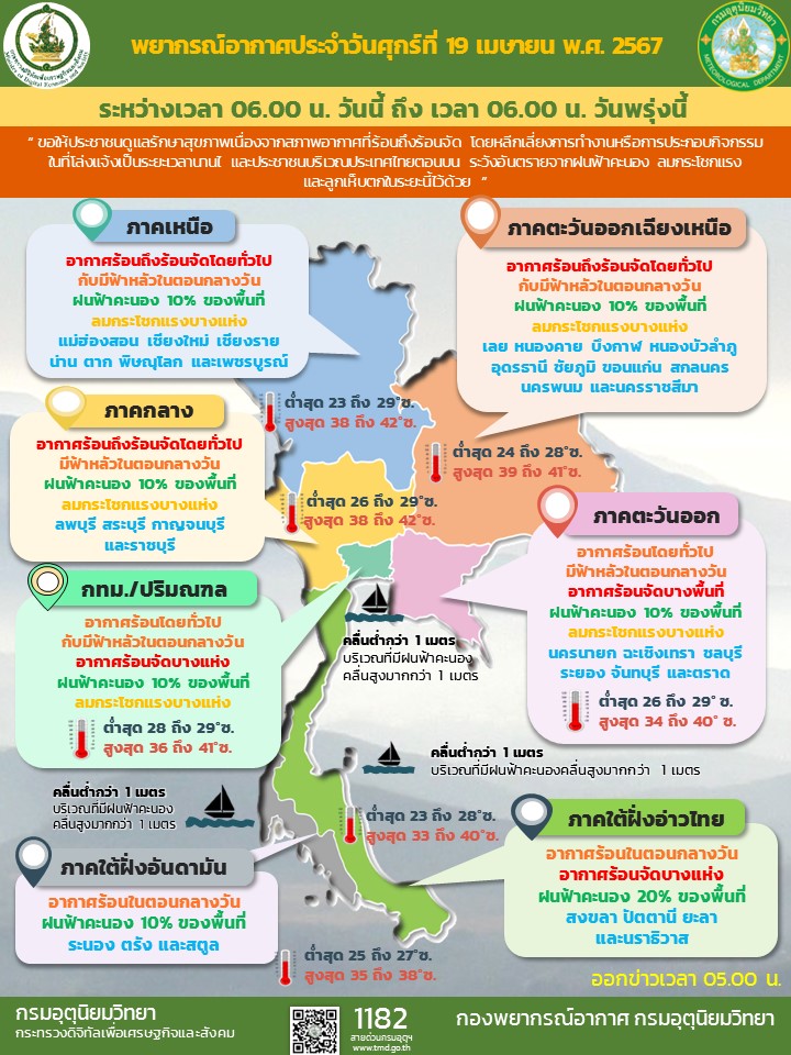 กรมอุตุนิยมวิทยา พยากรณ์อากาศ 24 ชั่วโมงข้างหน้า ความกดอากาศต่ำเนื่องจากความร้อนปกคลุมประเทศไทยตอนบน ลักษณะเช่นนี้ทำให้ประเทศไทยมีอากาศร้อนถึงร้อนจัดกับมีฟ้าหลัวในตอนกลางวัน ขอให้ประชาชนดูแลรักษาสุขภาพเนื่องจากสภาพอากาศที่ร้อนถึงร้อนจัด โดยหลีกเลี่ยงการทำงานหรือการประกอบกิจกรรมในที่โล่งแจ้งเป็นระยะเวลานานไว้ด้วย ในขณะที่ลมใต้และลมตะวันออกเฉียงใต้พัดนำความชื้นจากอ่าวไทย และทะเลจีนใต้ เข้ามาปกคลุมภาคตะวันออกเฉียงเหนือตอนล่าง ภาคกลางตอนล่าง และภาคตะวันออก ประกอบกับมีแนวพัดสอบของลมตะวันตกเฉียงใต้และลมใต้พัดปกคลุมภาคตะวันออกเฉียงเหนือตอนบน ลักษณะเช่นนี้ทำให้ประเทศไทยตอนบนมีฝนฟ้าคะนอง กับมีลมกระโชกแรงเกิดขึ้นได้บางพื้นที่ ขอให้ประชาชนในบริเวณดังกล่าว ระวังอันตรายจากฝนฟ้าคะนองและลมกระโชกแรงในระยะนี้ไว้ด้วย