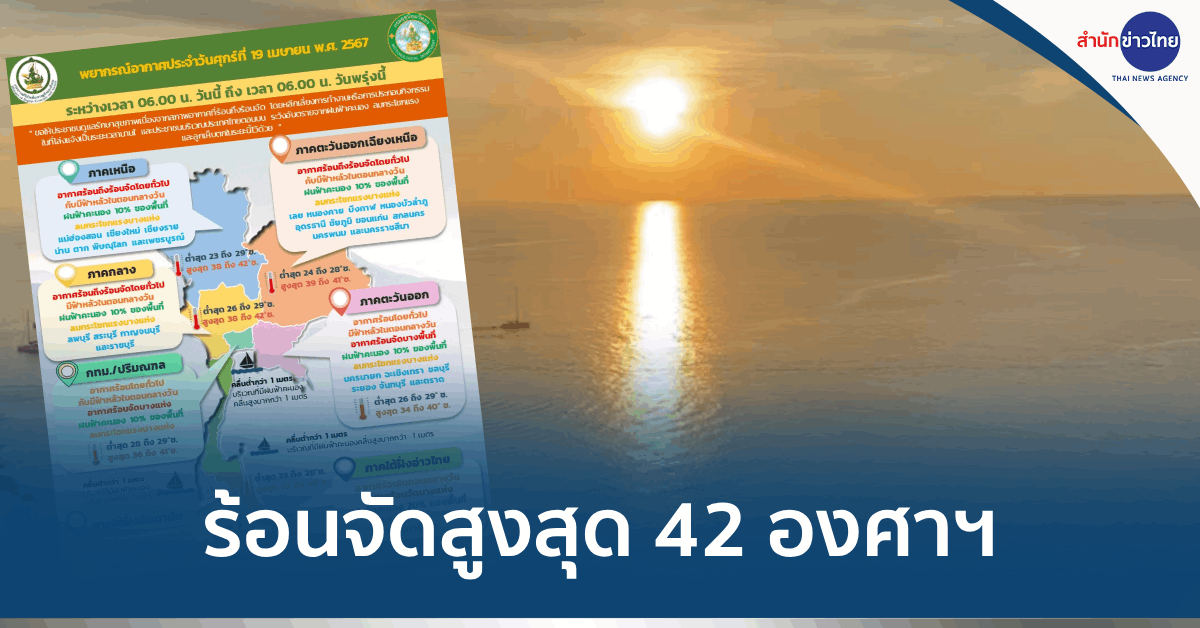 กรุงเทพฯ 19 เม.ย. – กรมอุตุฯ เผยประเทศไทยมีอากาศร้อนถึงร้อนจัดกับมีฟ้าหลัวในตอนกลางวัน ภาคเหนือ-กลาง อุณหภูมิสูงสุด 42 องศาฯ