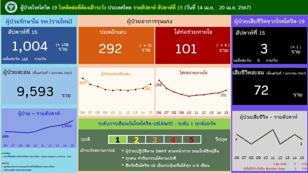ในช่วงสัปดาห์ที่ผ่านมา (วันที่ 14 – 20 เมษายน 2567) พบผู้ป่วยโรคโควิด 19 ที่ต้องรักษาตัวในโรงพยาบาลจำนวน 1,004 ราย เฉลี่ย 143 รายต่อวัน มีแนวโน้มเพิ่มขึ้นตามที่คาดการณ์ไว้ โดยพบผู้ป่วยมากขึ้นในพื้นที่กรุงเทพ ปริมณฑล และจังหวัดท่องเที่ยวหลายแห่ง และมีผู้ป่วยอาการรุนแรงปอดอักเสบ 292 ราย ใส่ท่อช่วยหายใจ 101 ราย และเสียชีวิต 3 ราย โดยผู้เสียชีวิตทุกรายเป็นกลุ่มผู้สูงอายุหรือมีโรคเรื้อรัง (608) คาดสาเหตุที่ทำให้มีการเพิ่มขึ้นของผู้ป่วยเนื่องจากส่วนใหญ่ผู้ป่วยมีอาการเหมือนไข้หวัด ทำให้ไม่ระวัง ป้องกันตนเองส่งผลให้ผู้ป่วยเพิ่มขึ้น อย่างไรก็ตาม จากการติดตามเฝ้าระวังสายพันธุ์ที่กำลังระบาดในประเทศไทย ข้อมูลจากกรมวิทยาศาสตร์การแพทย์ พบว่ายังคงเป็นสายพันธุ์รุ่นลูกของโอมิครอน โดยผู้ป่วยจะมีลักษณะอาการคล้ายหวัด เช่น ไข้ ไอ เจ็บคอ ปวดเมื่อย ตามตัว ปวดศีรษะ มีน้ำมูก โดยยังไม่พบว่ามีระดับความรุนแรงของโรคเพิ่มขึ้นจากสายพันธุ์โอมิครอนเดิมในปีที่ผ่านมา