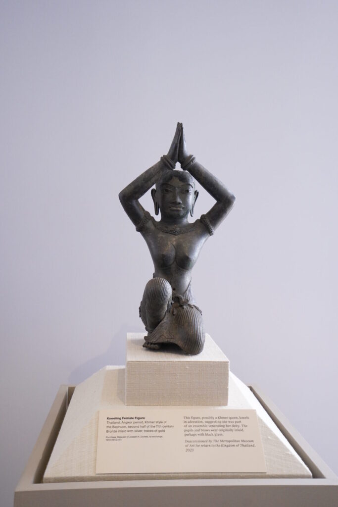นายเสริมศักดิ์ พงษ์พานิช รัฐมนตรีว่าการกระทรวงวัฒนธรรม เปิดเผยว่า สืบเนื่องจากพิพิธภัณฑ์ศิลปะเมโทรโพลิทัน (The MET) สหรัฐอเมริกา แจ้งความประสงค์ส่งคืนโบราณวัตถุประติมากรรมสำริด 2 รายการ ซึ่งมีหลักฐานว่าถูกนำออกจากประเทศไทยโดยผิดกฎหมาย ที่รู้จักกันในนามโกลเด้นบอย (Golden Boy) และประติมากรรมรูปสตรี จึงมอบหมายให้กรมศิลปากรประสานรายละเอียดขั้นตอนการรับมอบโบราณวัตถุ 2 รายการดังกล่าว ขณะนี้พิพิธภัณฑ์ศิลปะเมโทรโพลิทัน (The MET) ได้แจ้งให้ประเทศไทยส่งผู้เชี่ยวชาญร่วมตรวจสอบโบราณวัตถุที่จะส่งคืน โดยได้มอบหมายให้ นางสาวนิตยา กนกมงคล ผู้อำนวยการสำนักพิพิธภัณฑสถานแห่งชาติ กรมศิลปากร เดินทางไปร่วมตรวจสอบ เมื่อวันที่ 25 เมษายน 2567 ที่นครนิวยอร์ก สหรัฐอเมริกา ซึ่งในการนี้จะได้มีการหารือถึงรายละเอียดและกำหนดเวลาในการส่งคืน นอกจากนี้ยังจะมีการลงนามในบันทึกความเข้าใจระหว่างกรมศิลปากร และพิพิธภัณฑ์ศิลปะเมโทรโพลิทัน (The MET) เพื่อความร่วมมือทางวิชาการด้านพิพิธภัณฑ์ โดยมีนายพนมบุตร จันทรโชติ อธิบดีกรมศิลปากร และนายแมกซ์ ฮอลเลน ผู้อำนวยการและประธานกรรมการบริหารพิพิธภัณฑ์ศิลปะเมโทโพลิทัน เป็นผู้ลงนามบันทึกความเข้าใจ และมีนางสาวสมใจ ตะเภาพงษ์ กงสุลใหญ่ ณ นครนิวยอร์ก สหรัฐอเมริกา ร่วมเป็นสักขีพยาน