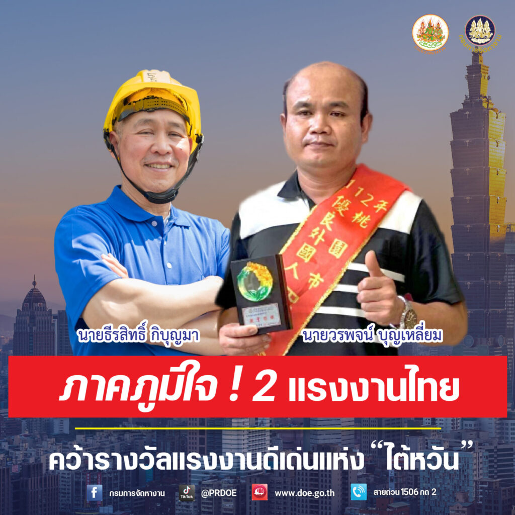 28 เม.ย. – 2 แรงงานไทยสร้างชื่อ คว้ารางวัลแรงงานคุณภาพขวัญใจนายจ้าง เตรียมพบประธานาธิบดีไต้หวัน “พิพัฒน์” ชื่นชมเป็นมาตรฐานสร้างโอกาสส่งทำงานเพิ่ม