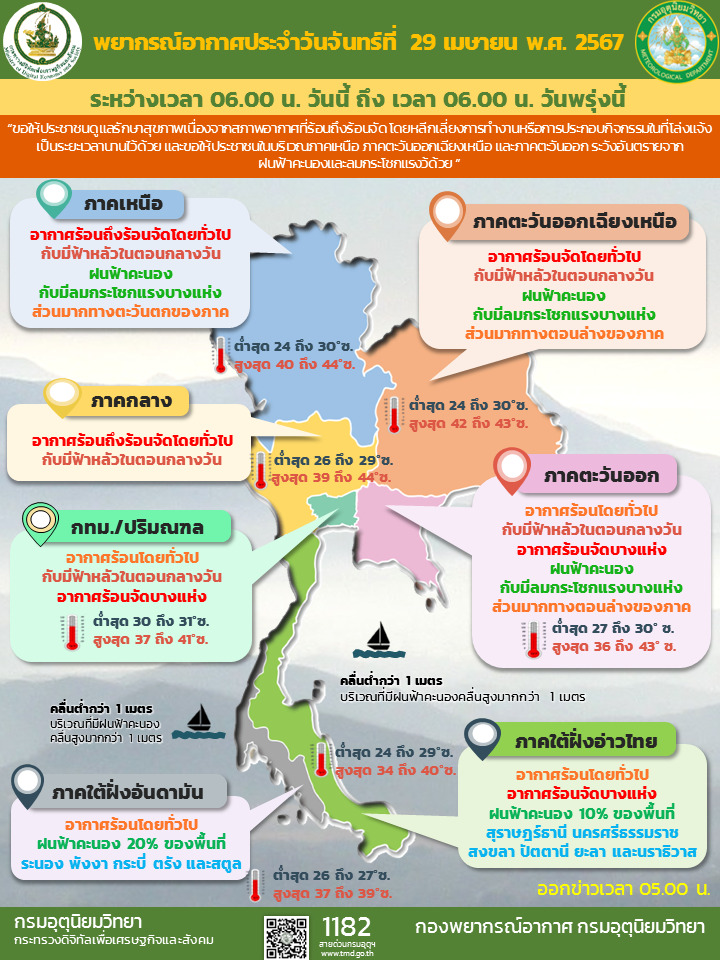 กรมอุตุนิยมวิทยา พยากรณ์อากาศ 24 ชั่วโมงข้างหน้า ความกดอากาศต่ำเนื่องจากความร้อนปกคลุมประเทศไทยตอนบน ลักษณะเช่นนี้ทำให้ประเทศไทยมีอากาศร้อนถึงร้อนจัดโดยทั่วไปกับมีฟ้าหลัวในตอนกลางวัน ขอให้ประชาชนดูแลรักษาสุขภาพเนื่องจากสภาพอากาศที่ร้อนถึงร้อนจัด โดยหลีกเลี่ยงการทำงานหรือการประกอบกิจกรรมในที่โล่งแจ้งเป็นระยะเวลานานไว้ด้วย ในขณะที่มีลมใต้และลมตะวันตกเฉียงใต้พัดปกคลุมภาคตะวันออกเฉียงเหนือตอนล่างและภาคตะวันออก ทำให้บริเวณดังกล่าวยังคงมีฝนฟ้าคะนองกับมีลมกระโชกแรงบางแห่ง ขอให้ประชาชนระวังอันตรายจากฝนฟ้าคะนองและลมกระโชกแรงไว้ด้วย สำหรับลมตะวันออกเฉียงใต้พัดปกคลุมอ่าวไทย ภาคใต้ และทะเลอันดามัน ทำให้ภาคใต้มีฝนฟ้าคะนองบางแห่ง