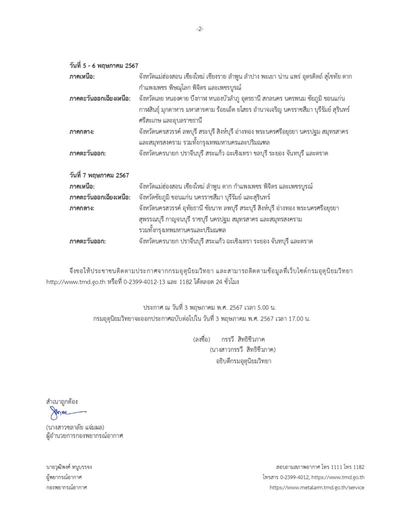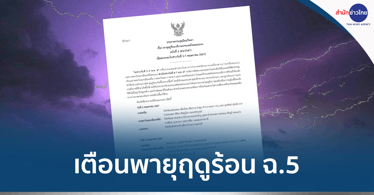 ประกาศกรมอุตุนิยมวิทยา เรื่อง พายุฤดูร้อนบริเวณประเทศไทยตอนบน ฉบับที่ 5 มีผลกระทบในช่วงวันที่ 3-7 พฤษภาคม 2567