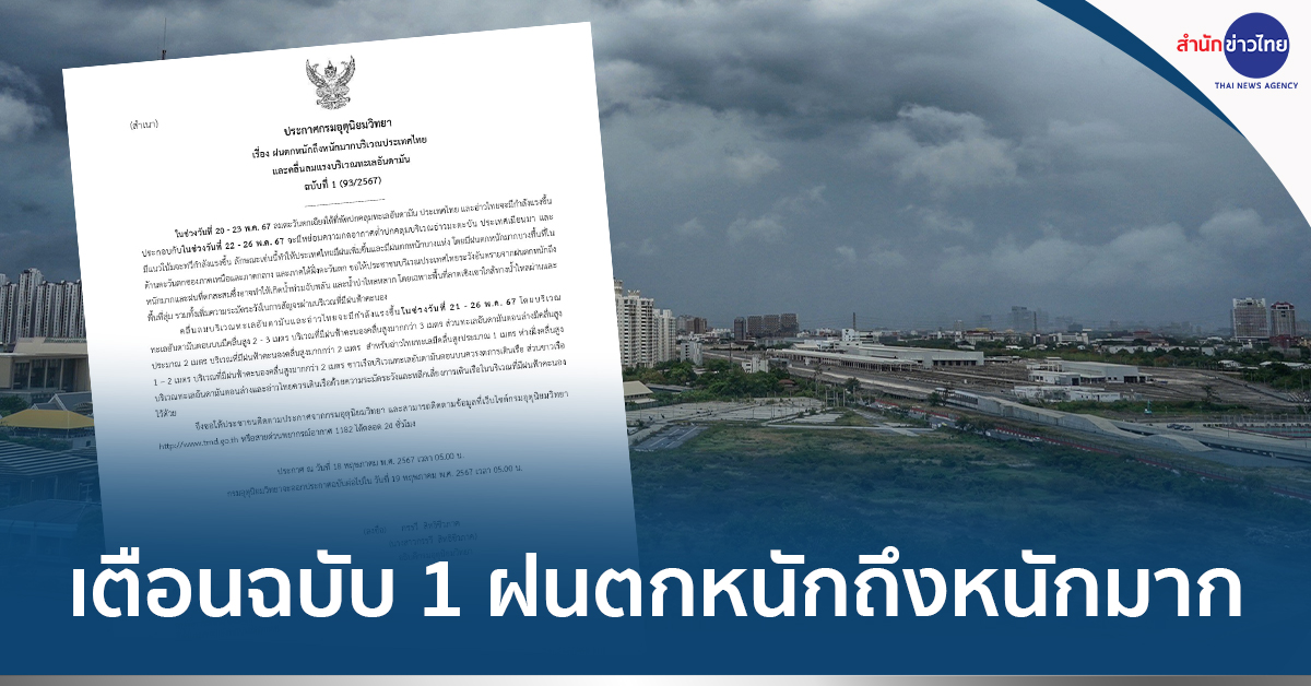 กทม. 18 พ.ค.- กรมอุตุนิยมวิทยา ประกาศเตือนฉบับที่ 1 เรื่อง ฝนตกหนักถึงหนักมากบริเวณประเทศไทย และคลื่นลมแรงบริเวณทะเลอันดามัน