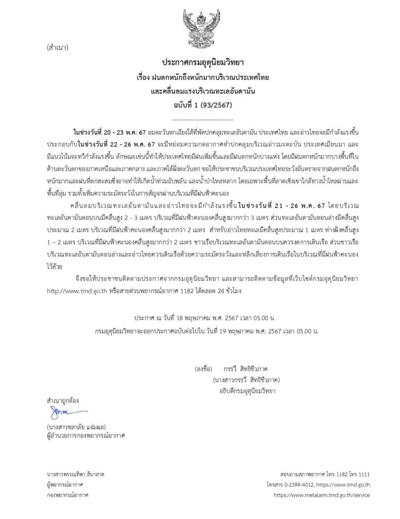 กรมอุตุนิยมวิทยา เผยช่วงวันที่ 20 – 23 พ.ค. 67 ลมตะวันตกเฉียงใต้ที่พัดปกคลุมทะเลอันดามัน ประเทศไทย และอ่าวไทยจะมีกำลังแรงขึ้น ประกอบกับในช่วงวันที่ 22 – 26 พ.ค. 67 จะมีหย่อมความกดอากาศต่ำปกคลุมบริเวณอ่าวมะตะบัน ประเทศเมียนมา และมีแนวโน้มจะทวีกำลังแรงขึ้น ลักษณะเช่นนี้ทำให้ประเทศไทยมีฝนเพิ่มขึ้นและมีฝนตกหนักบางแห่ง โดยมีฝนตกหนักมากบางพื้นที่ในด้านตะวันตกของภาคเหนือและภาคกลาง และภาคใต้ฝั่งตะวันตก ขอให้ประชาชนบริเวณประเทศไทยระวังอันตรายจากฝนตกหนักถึงหนักมากและฝนที่ตกสะสมซึ่งอาจทำให้เกิดน้ำท่วมฉับพลัน และน้ำป่าไหลหลาก โดยเฉพาะพื้นที่ลาดเชิงเขาใกล้ทางน้ำไหลผ่านและพื้นที่ลุ่ม รวมทั้งเพิ่มความระมัดระวังในการสัญจรผ่านบริเวณที่มีฝนฟ้าคะนอง คลื่นลมบริเวณทะเลอันดามันและอ่าวไทยจะมีกำลังแรงขึ้นในช่วงวันที่ 21 – 26 พ.ค. 67 โดยบริเวณทะเลอันดามันตอนบนมีคลื่นสูง 2 – 3 เมตร บริเวณที่มีฝนฟ้าคะนองคลื่นสูงมากกว่า 3 เมตร ส่วนทะเลอันดามันตอนล่างมีคลื่นสูงประมาณ 2 เมตร บริเวณที่มีฝนฟ้าคะนองคลื่นสูงมากกว่า 2 เมตร สำหรับอ่าวไทยทะเลมีคลื่นสูงประมาณ 1 เมตร ห่างฝั่งคลื่นสูง 1 – 2 เมตร บริเวณที่มีฝนฟ้าคะนองคลื่นสูงมากกว่า 2 เมตร ชาวเรือบริเวณทะเลอันดามันตอนบนควรงดการเดินเรือ ส่วนชาวเรือบริเวณทะเลอันดามันตอนล่างและอ่าวไทยควรเดินเรือด้วยความระมัดระวังและหลีกเลี่ยงการเดินเรือในบริเวณที่มีฝนฟ้าคะนองไว้ด้วย จึงขอให้ประชาชนติดตามประกาศจากทางกรมอุตุนิยมวิทยาอย่างใกล้ชิด