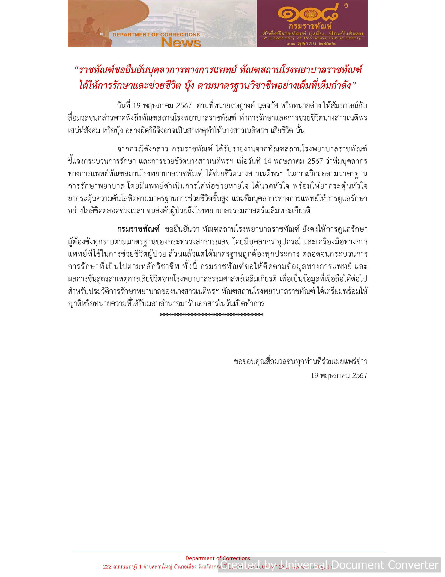 กรมราชทัณฑ์ ขอยืนยันว่า ทัณฑสถานโรงพยาบาลราชทัณฑ์ ยังคงให้การดูแลรักษาผู้ต้องขังทุกรายตามมาตรฐานของกระทรวงสาธารณสุข โดยมีบุคลากร อุปกรณ์ และเครื่องมือทางการแพทย์ที่ใช้ในการช่วยชีวิตผู้ป่วย ล้วนแล้วแต่ได้มาตรฐานถูกต้องทุกประการ ตลอดจนกระบวนการ การรักษาที่เป็นไปตามหลักวิชาชีพ ทั้งนี้ กรมราชทัณฑ์ขอให้ติดตามข้อมูลทางการแพทย์ และผลการชันสูตรสาเหตุการเสียชีวิตจากโรงพยาบาลธรรมศาสตร์เฉลิมพระเกียรติ เพื่อเป็นข้อมูลที่เชื่อถือได้ต่อไป สำหรับประวัติการรักษาพยาบาลของนางสาวเนติพร ทัณฑสถานโรงพยาบาลราชทัณฑ์ ได้เตรียมพร้อมให้ญาติหรือทนายความที่ได้รับมอบอำนาจมารับเอกสารในวันเปิดทำการ.-119.-สำนักข่าวไทย