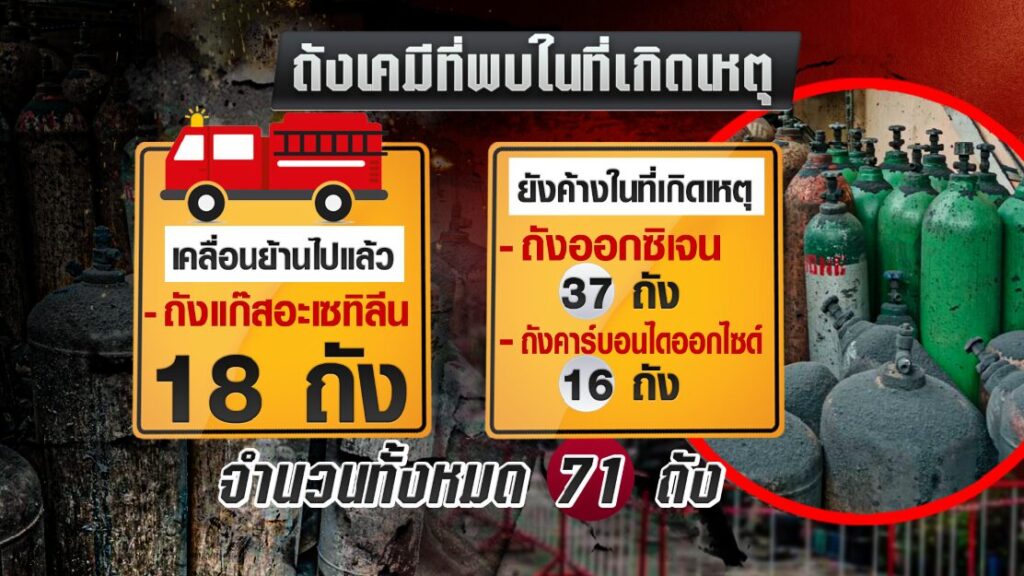 สำหรับจำนวนถังเคมีที่พบในบ้านพักจากเหตุระเบิด มีจำนวนทั้งหมด 71 ถัง ในจำนวนนี้มี ถังก๊าซอเซทีลีน จำนวน 18 ถัง ถูกเคลื่อนย้ายออกไปแล้วเมื่อช่วงเย็นวานนี้ ในส่วนที่เหลือจะเป็นถังอ๊อกซิเจน 37 ถัง และถังคาร์บอนไดออกไซด์ 16 ถัง ที่ยังคงค้างอยู่