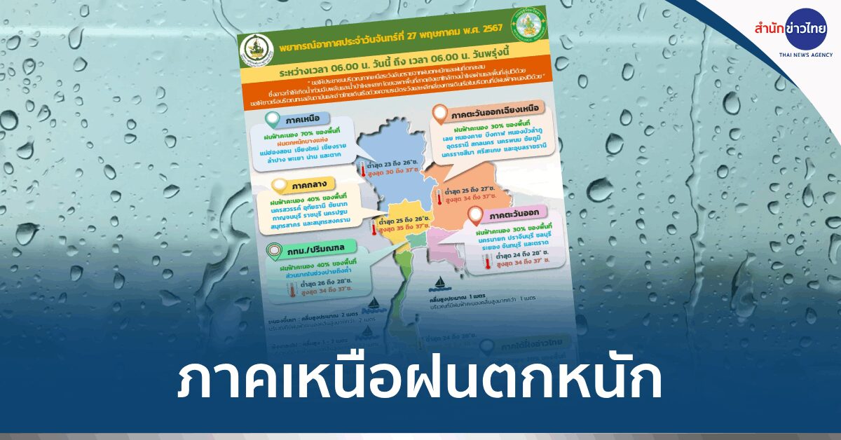 ภาคเหนือ : มีฝนฟ้าคะนอง ร้อยละ 70 ของพื้นที่ และมีฝนตกหนักบางแห่ง บริเวณจังหวัดแม่ฮ่องสอน เชียงใหม่ เชียงราย ลำปาง พะเยา น่าน และตาก อุณหภูมิต่ำสุด 23-26 องศาเซลเซียส อุณหภูมิสูงสุด 30-37 องศาเซลเซียส ลมตะวันตกเฉียงใต้ ความเร็ว 10-20 กม./ชม.