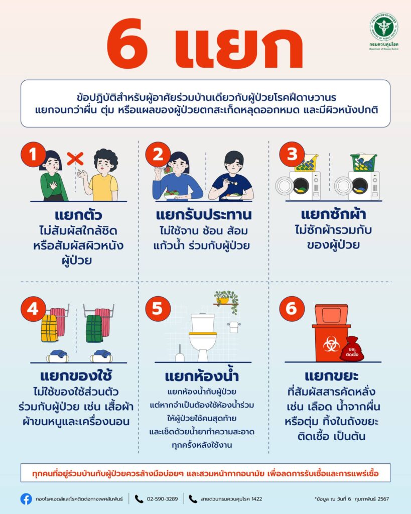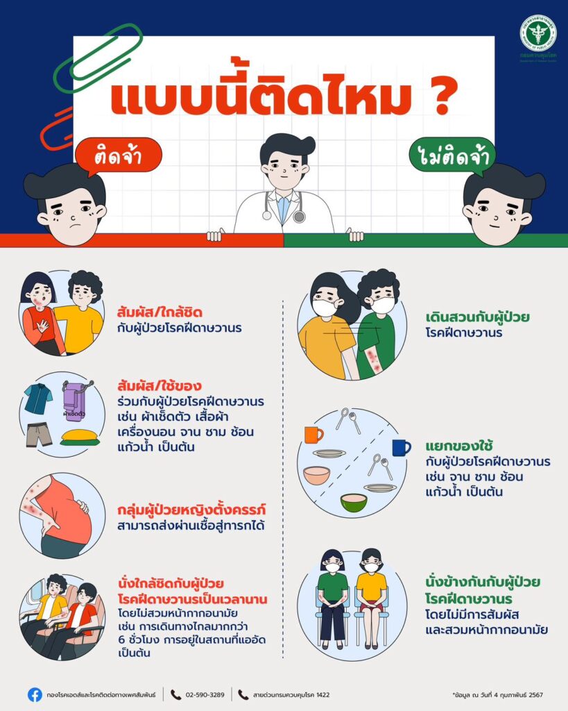 กรมควบคุมโรค เผยสถานการณ์โรคฝีดาษวานรในประเทศไทย ยังพบผู้ป่วยเป็นระยะ และมีแนวโน้มเพิ่มสูงขึ้นในช่วงเดือนพฤษภาคม โดยทั่วไปโรคมีความรุนแรงน้อย แต่จะมีความรุนแรงมากขึ้นในกลุ่มผู้ป่วยภูมิคุ้มกันต่ำ ติดจากการสัมผัสแนบชิดกับผู้ป่วย ผู้ที่มีผื่น ตุ่ม หรือหนอง แนะนำป้องกันตัวเอง โดยเฉพาะ กิจกรรมที่มีโอกาสนำไปสู่การมีเพศสัมพันธ์กับคนไม่รู้จัก หรือกิจกรรมที่มีการรวมตัวของคนจำนวนมากที่อาจเสี่ยงติดโรคจากการสัมผัสผิวหนังหรือสารคัดหลั่ง ส่วนโอกาสรับเชื้อจากการพูดคุยใกล้ชิดเป็นระยะเวลานาน เป็นไปได้ค่อนข้างต่ำ