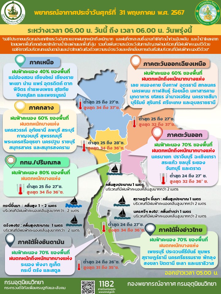 กรมอุตุนิยมวิทยา พยากรณ์อากาศ 24 ชั่วโมงข้างหน้า มรสุมตะวันตกเฉียงใต้กำลังปานกลางพัดปกคลุมทะเลอันดามัน ประเทศไทย และอ่าวไทย ในขณะที่มีหย่อมความกดอากาศต่ำบริเวณอ่าวตังเกี๋ยและพายุดีเปรสชันบริเวณทะเลจีนใต้ตอนกลาง ลักษณะเช่นนี้ทำให้ประเทศไทยมีฝนเพิ่มขึ้นและมีฝนตกหนักถึงหนักมากบางแห่ง บริเวณภาคตะวันออกเฉียงเหนือ ภาคกลาง รวมทั้งกรุงเทพมหานครและปริมณฑล ภาคตะวันออกและภาคใต้ ขอให้ประชาชนบริเวณประเทศไทยระวังอันตรายจากฝนตกหนักถึงหนักมาก และฝนที่ตกสะสมซึ่งอาจทำให้เกิดน้ำท่วมฉับพลัน และน้ำป่าไหลหลาก โดยเฉพาะพื้นที่ลาดเชิงเขาใกล้ทางน้ำไหลผ่านและพื้นที่ลุ่ม รวมทั้งเพิ่มความระมัดระวังในการสัญจรผ่านบริเวณที่มีฝนฟ้าคะนองไว้ด้วย