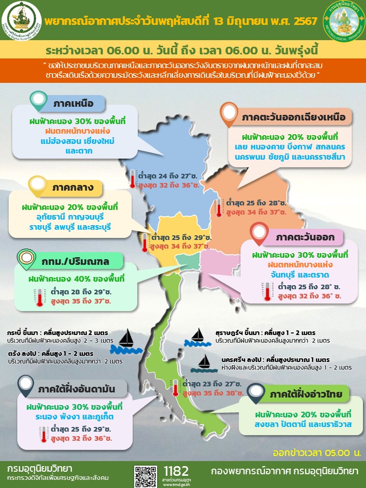กรมอุตุนิยมวิทยา พยากรณ์อากาศ 24 ชั่วโมงข้างหน้า มรสุมตะวันตกเฉียงใต้กำลังปานกลางพัดปกคลุมทะเลอันดามัน ประเทศไทย และอ่าวไทย ลักษณะเช่นนี้ทำให้มีฝนตกหนักบางแห่งบริเวณภาคเหนือและภาคตะวันออก ขอให้ประชาชนในบริเวณดังกล่าวระวังอันตรายจากฝนตกหนักและฝนที่ตกสะสม สำหรับคลื่นลมบริเวณทะเลอันดามันตอนบนมีกำลังปานกลาง โดยมีคลื่นสูงประมาณ 2 เมตร บริเวณที่มีฝนฟ้าคะนองคลื่นสูงมากกว่า 2 เมตร ขอให้ชาวเรือในบริเวณดังกล่าวเดินเรือด้วยความระมัดระวังและหลีกเลี่ยงการเดินเรือในบริเวณที่มีฝนฟ้าคะนองไว้ด้วย