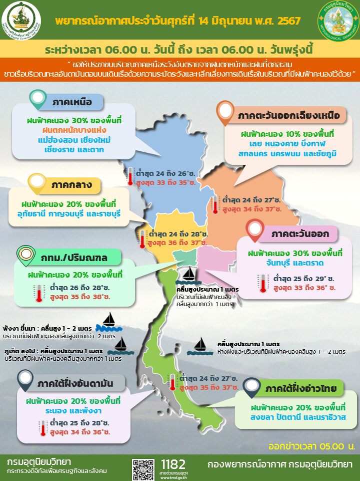 กรุงเทพฯ 14 มิ.ย. – กรมอุตุฯ เผยประเทศไทยมีฝนลดลง แต่ยังคงมีฝนตกหนักบางแห่งบริเวณภาคเหนือ ส่วน กทม.-ปริมณฑล ฝนฟ้าคะนอง 20% ของพื้นที่